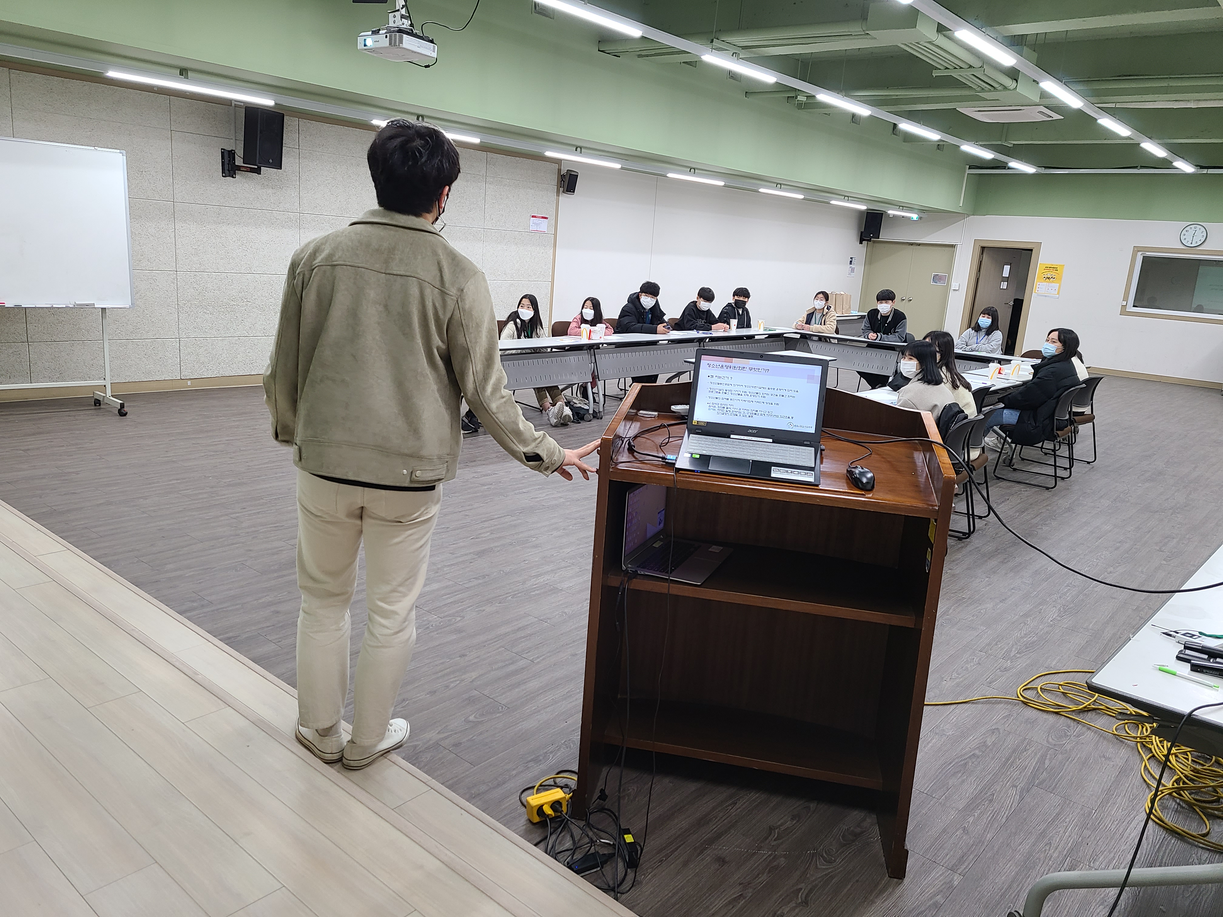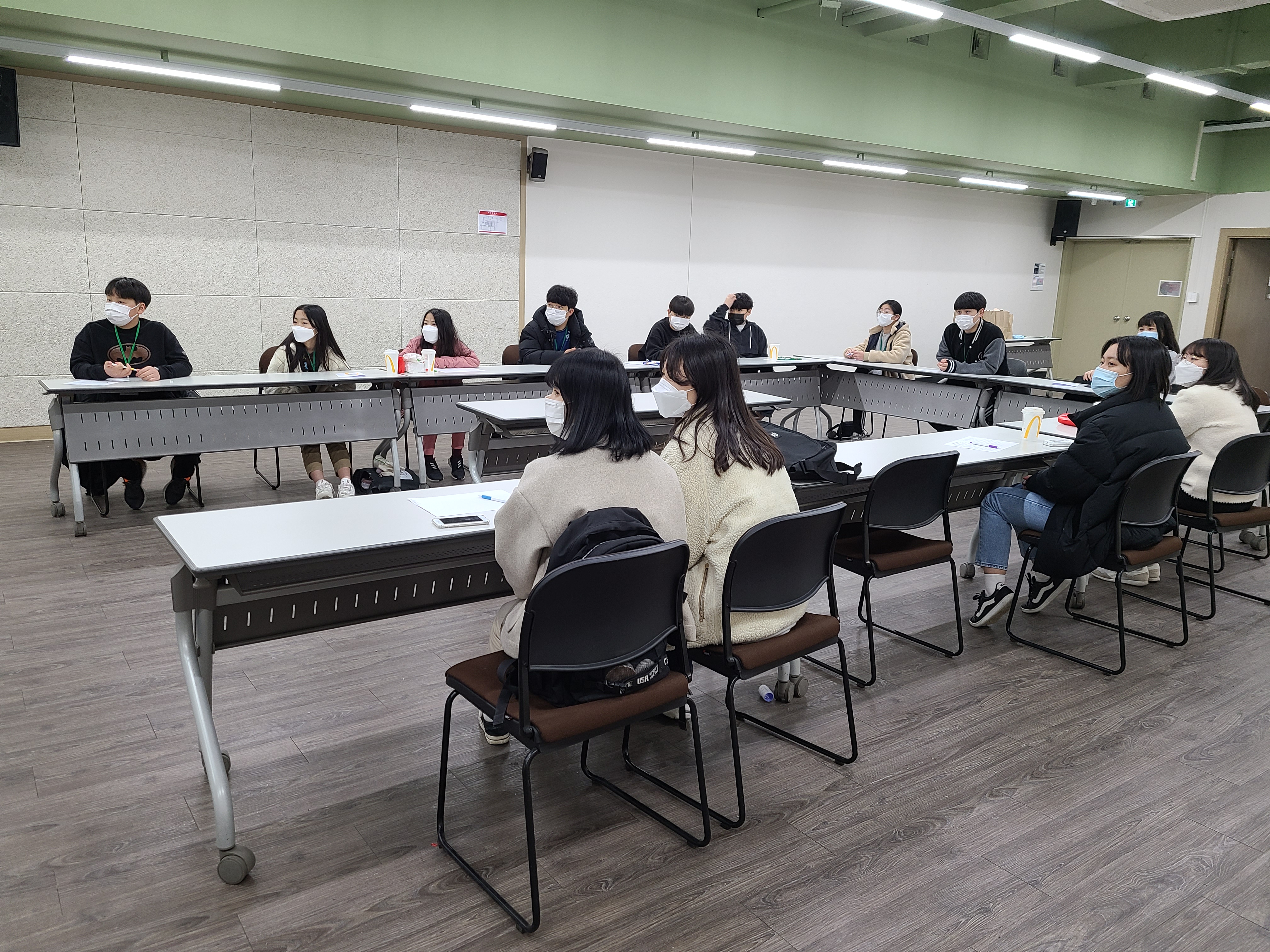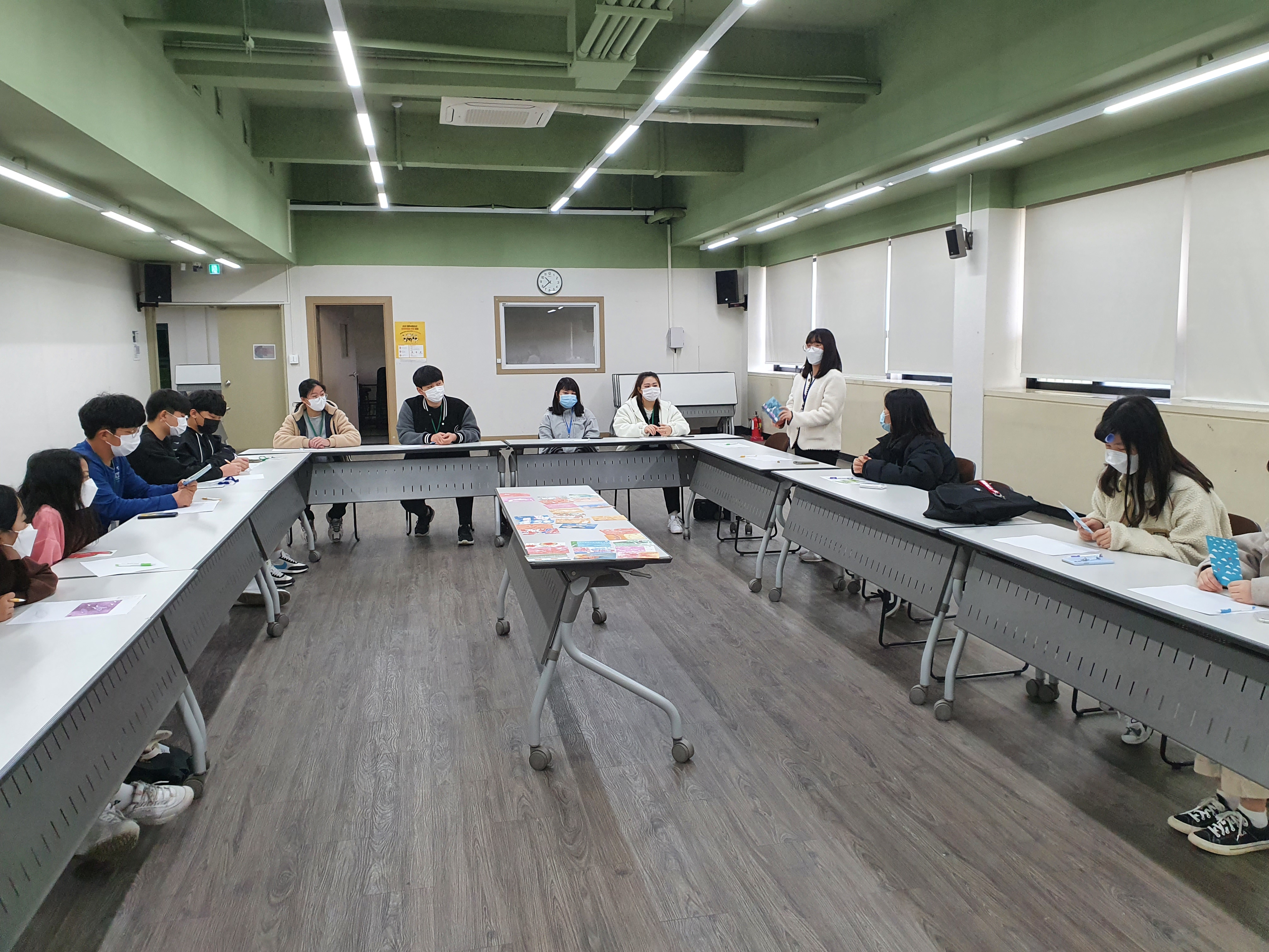 그렇게 모집되어진 청소년운영위원들이 한자리에 모여서 안전한 공간 방역 거리두기 확실히 하여!