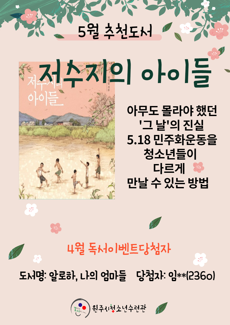 #원주시청소년수련관#도란도란도서관#작은도서관#5월추천도서#저수지의 아이들#5.18민주화운동#뜨거운관심#독서이벤트#줄을서시오