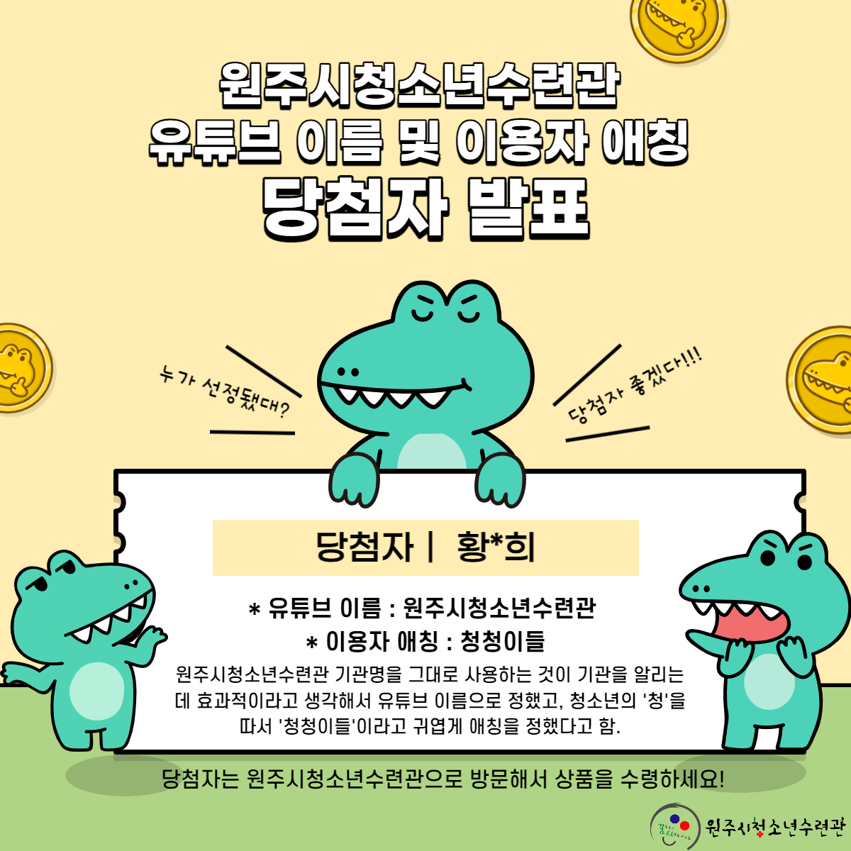 원주시청소년수련관 [유튜브 이름, 이용자 애칭] 공모 당첨자 발표!!!