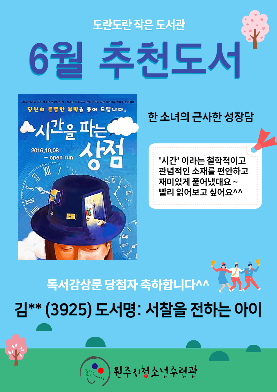추리라는 숨김과 드러냄 전략이 잘 세워져 있고, 청소년 주인공을 내세워 시간이란 주제를 무난하고 자연스럽게 소화해내고 있다. 무엇보다 문장이 깔끔하고 잘 다듬어져 있으며 사건 진행의 속도와 문장 호흡의 길이도 잘 어우러진다. _박경장(문학평론가)