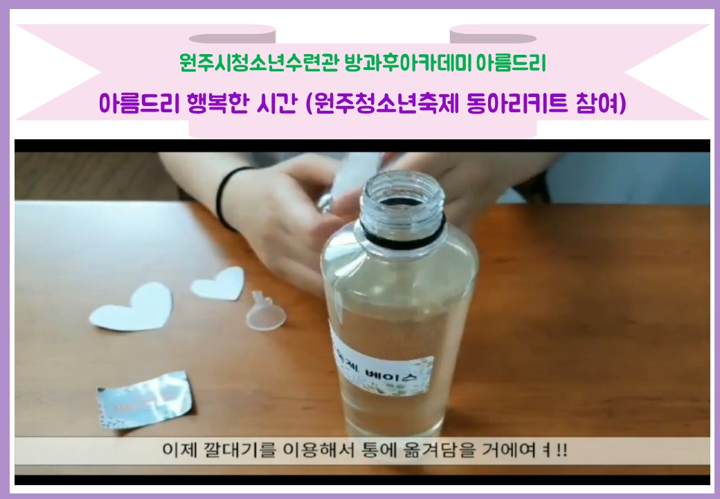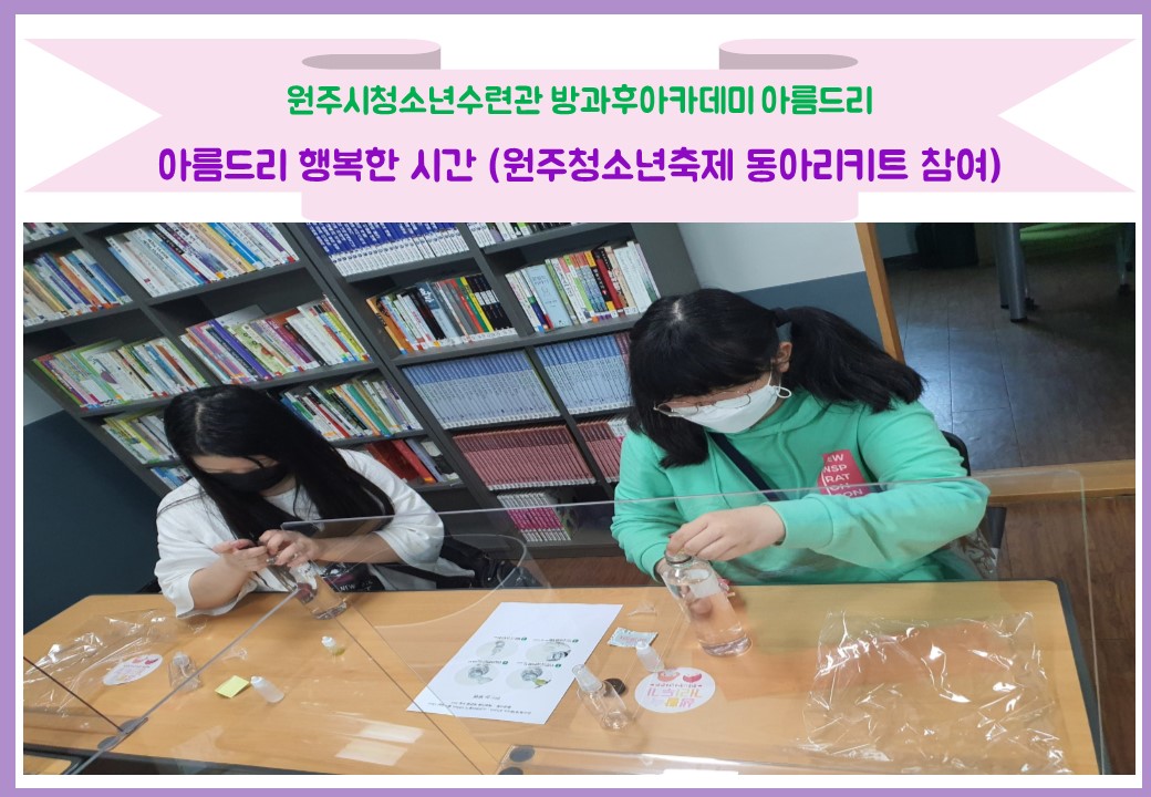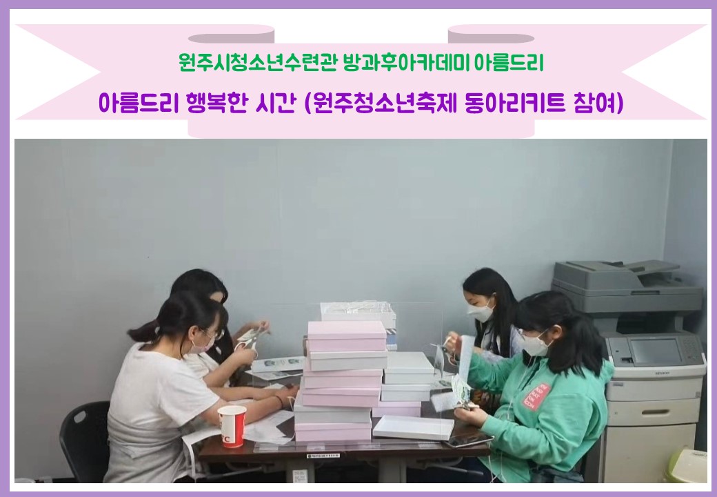 원주청소년축제 '꽃이피다' 동아리키트 부문에 아름드리 청소년들이 참가하여 아름드리의 특성에 맞춘 체험키트를 정하고 키트 만드는 방법 및 아름드리 홍보물을 제작해 보는 시간을 가졌습니다. 청소년들이 지역사회와 교류할 수 있는 새로운 경험이었습니다.