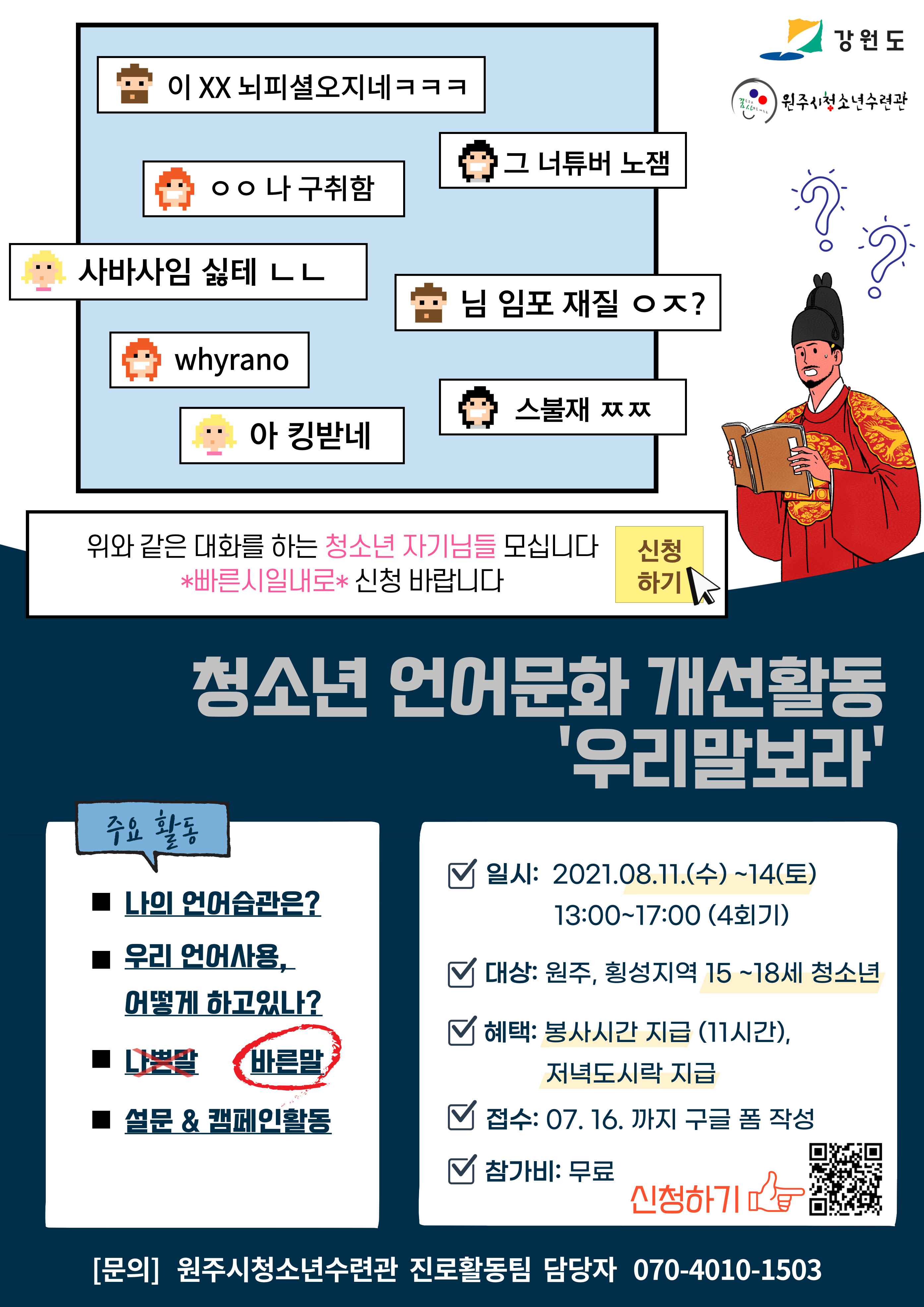 📍 모집대상:  자신과 친구들의 언어습관이 궁금한!  원주 및 횡성지역 15~ 18세 청소년 15명