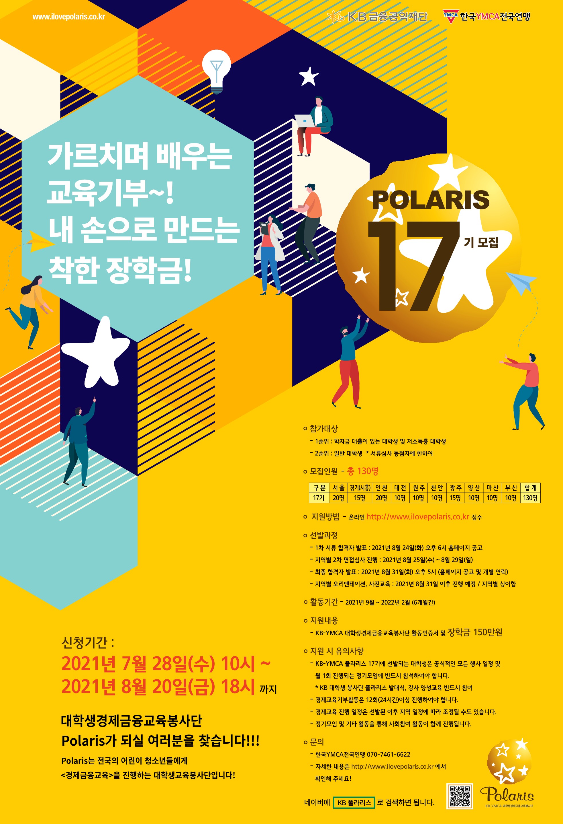 - KB-YMCA 폴라리스 17기에 선발되는 대학생은 공식적인 모든 행사 일정 및 월 1회 진행되는 정기모임에 반드시 참석해야 합니다
