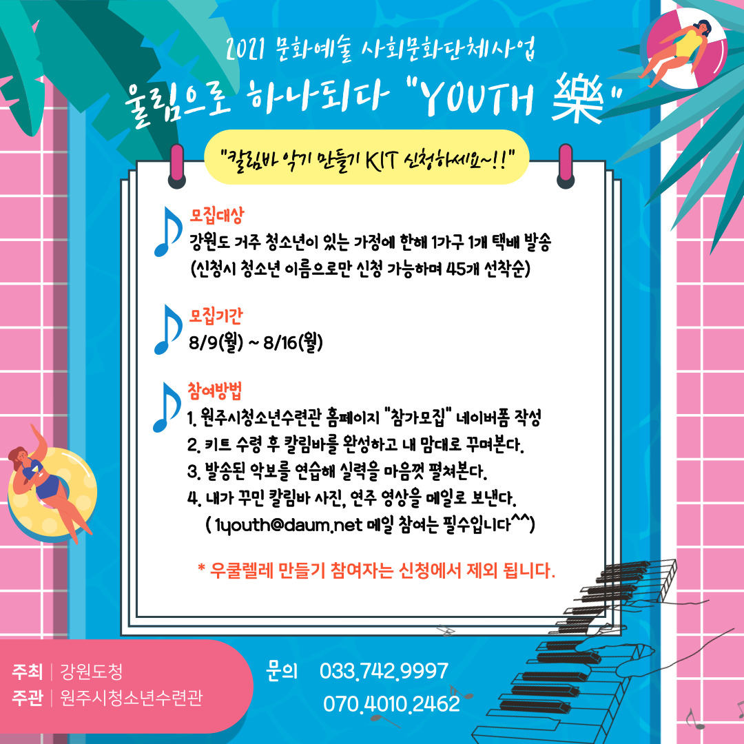 강원도 거주 청소년이 있는 가정에 한해 1가구 1개 택배 발송 (신청시 청소년 이름으로만 신청 가능하며 45개 선착순) *우쿨렐레 참여자는 신청에서 제외됩니다.