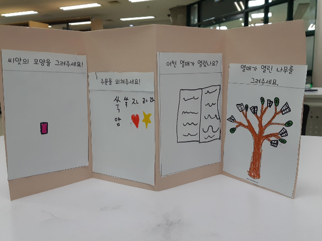 셋째주는 미야니시타츠야의 <신기한 씨앗가게>를 읽고 내가 상상하는 씨앗과 마법의 주문, 그리고 그 씨앗이 자라서 나무가 되었을 때의 모습을 미니북으로 꾸며보았습니다. 아이들이 상상한 나무는 어떤 모습일까요?^^