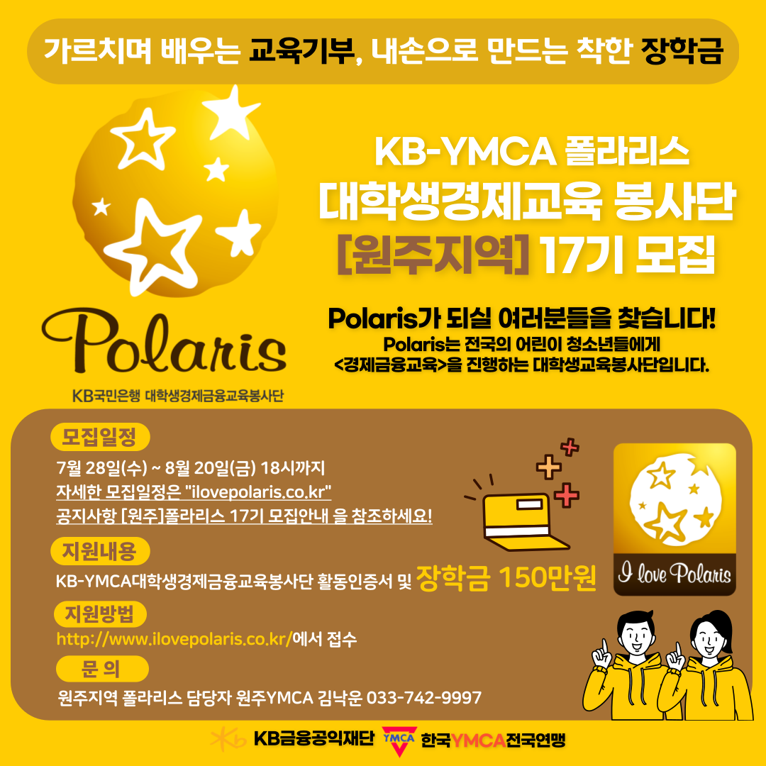 #원주 #대학생 #대외활동 #봉사활동 #장학금 #150만원 #kb #국민은행 #폴라리스 #17기모집 #대학생경제교육봉사단 #스펙 #원주ymca #한국ymca전국연맹 #ymca #교육기부 #교육봉사