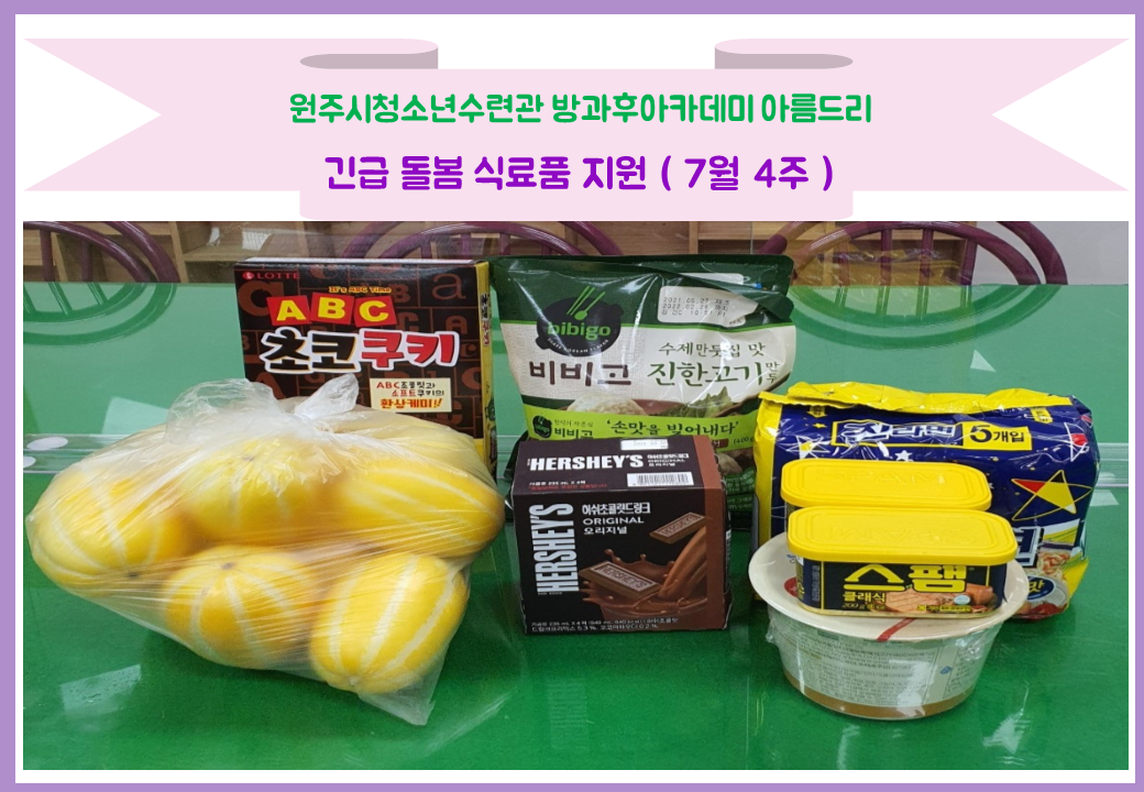 원주시청소년수련관 방과후아카데미 아름드리에서는 코로나-19 대응에 따른 긴급돌봄 지원으로 7월 4주 긴급 돌봄 식료품을 전달 및 배송하였습니다.