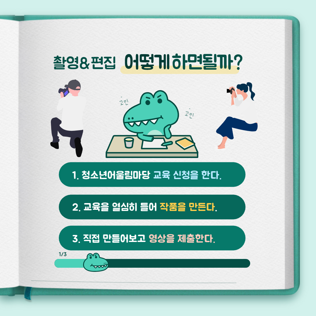 ▶ 모집 기간 : 08.25 ~ 09.03 ▶ 모집 대상 : 14세 ~ 19세 청소년 ▶ 모집 인원 : 총 15명 ▶ 교육 기간 : 9월11일 ~10월 2일까지 매주 토요일 4회기 ▶ 교육 내용 : 영상촬영 기획방법 및 촬영, 편집 교육 진
