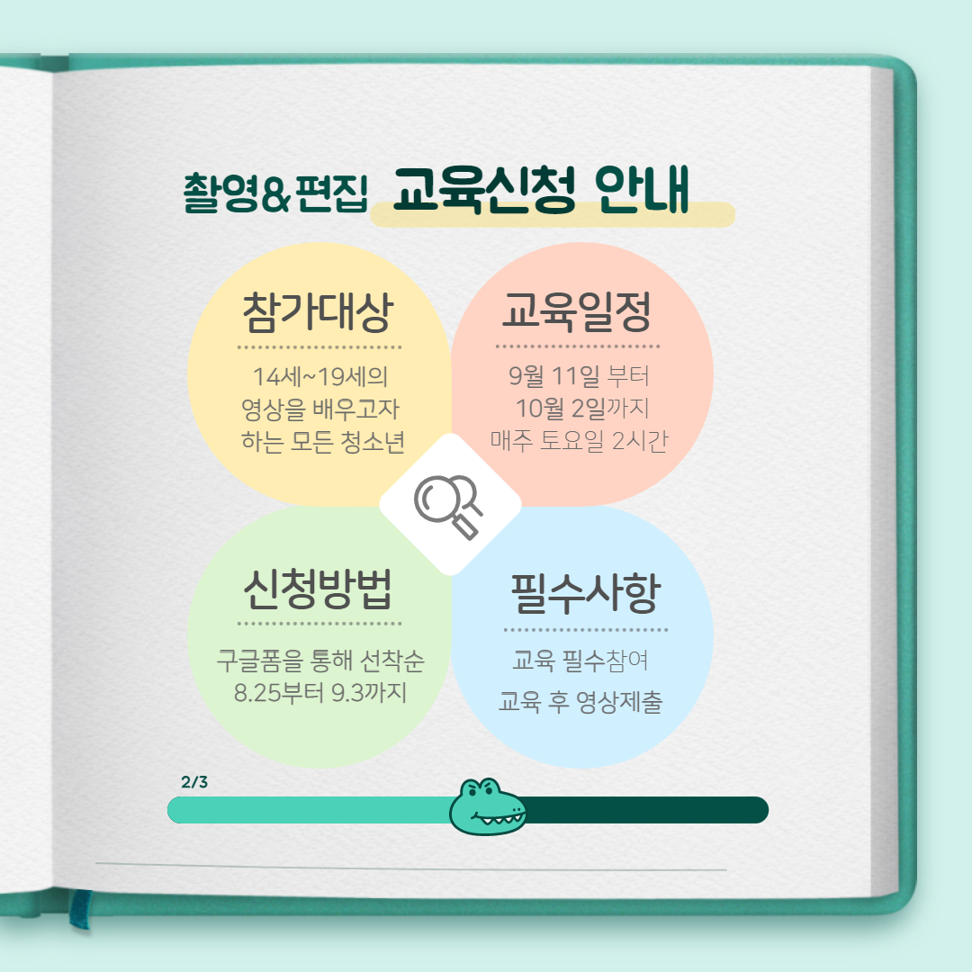 ▶ 모집 기간 : 08.25 ~ 09.03 ▶ 모집 대상 : 14세 ~ 19세 청소년 ▶ 모집 인원 : 총 15명 ▶ 교육 기간 : 9월11일 ~10월 2일까지 매주 토요일 4회기 ▶ 교육 내용 : 영상촬영 기획방법 및 촬영, 편집 교육 진