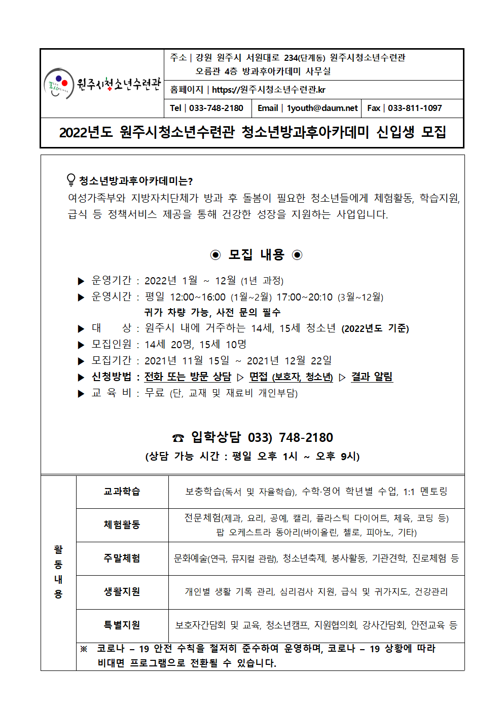 2022년도 원주시청소년수련관 청소년방과후아카데미 신입생 모집