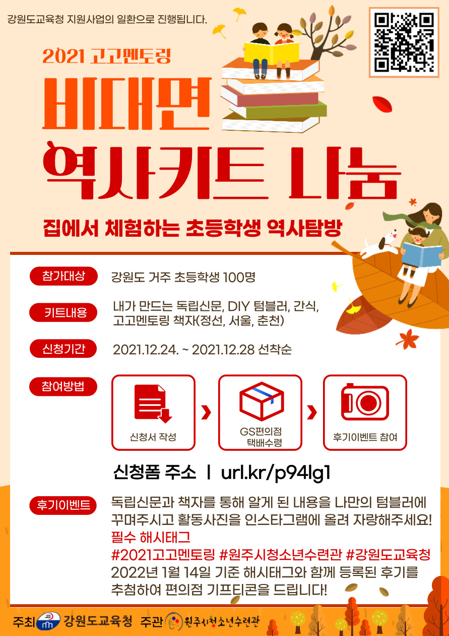 📍 후기이벤트 : ~ 2022년 1월 13일까지 활동 후기를 인스타그램에 #2021고고멘토링 #원주시청소년수련관 #강원도교육청 필수 해시태그와 함께 올려주시면 추첨을 통해 편의점 기프티콘을 드립니다! 1월 14일 기준 등록되어있는 게시물이 추첨 대상입니다. ​