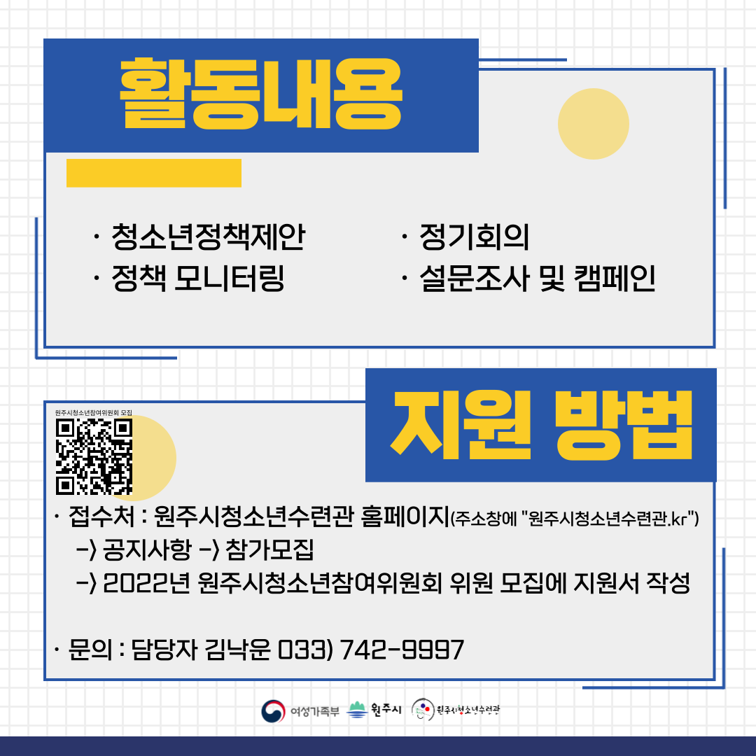 - 지원방법 : 원주시청소년수련관 홈페이지(원주시청소년수련관.kr) -> 공지사항 -> 2022원주시청소년참여위원회 모집 게시글에 접속하여 지원서 아래 링크 클릭하여