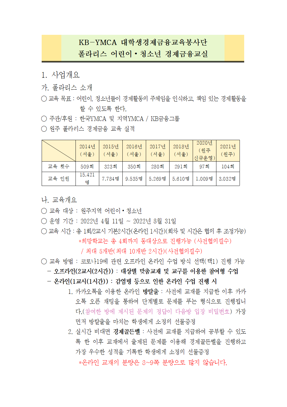KB금융-YMCA 폴라리스 경제금융교육 교육 신청 안내(학교/시설)
