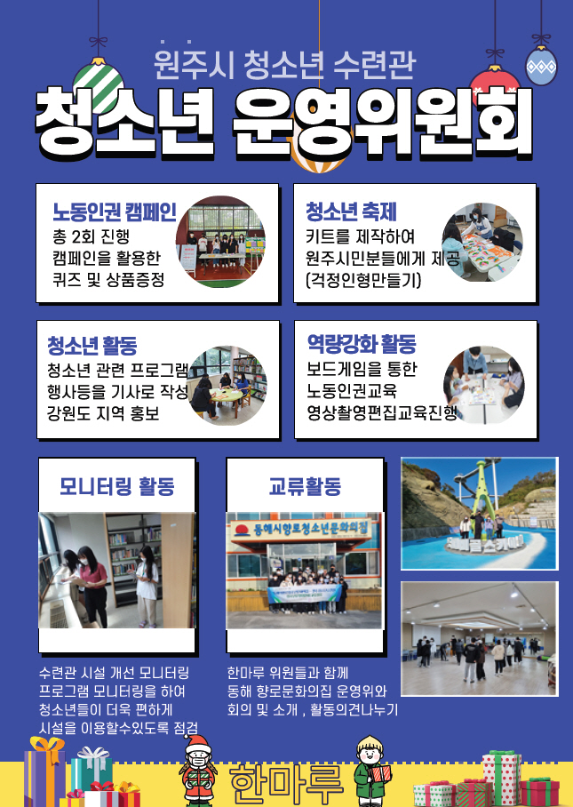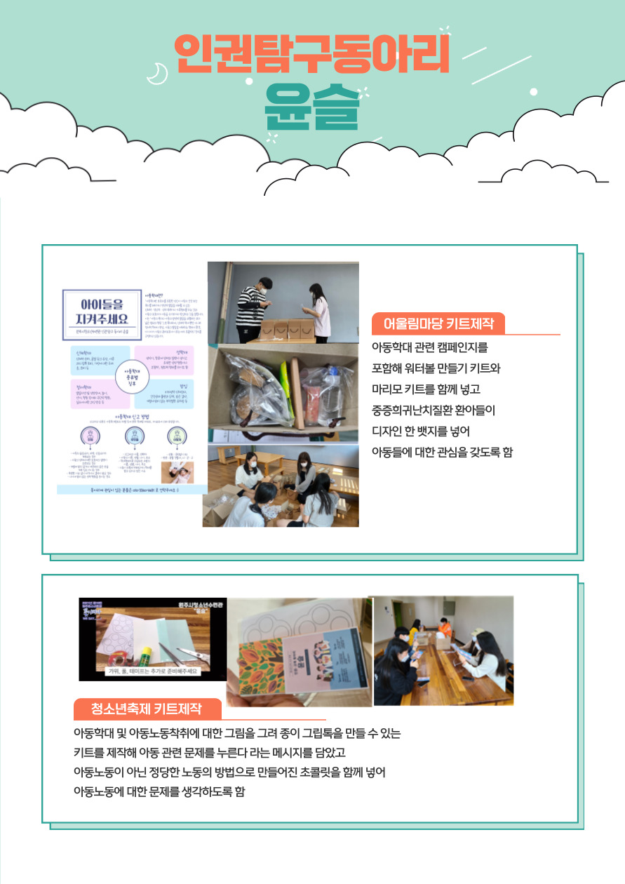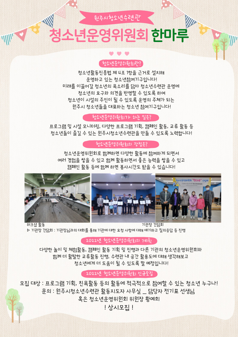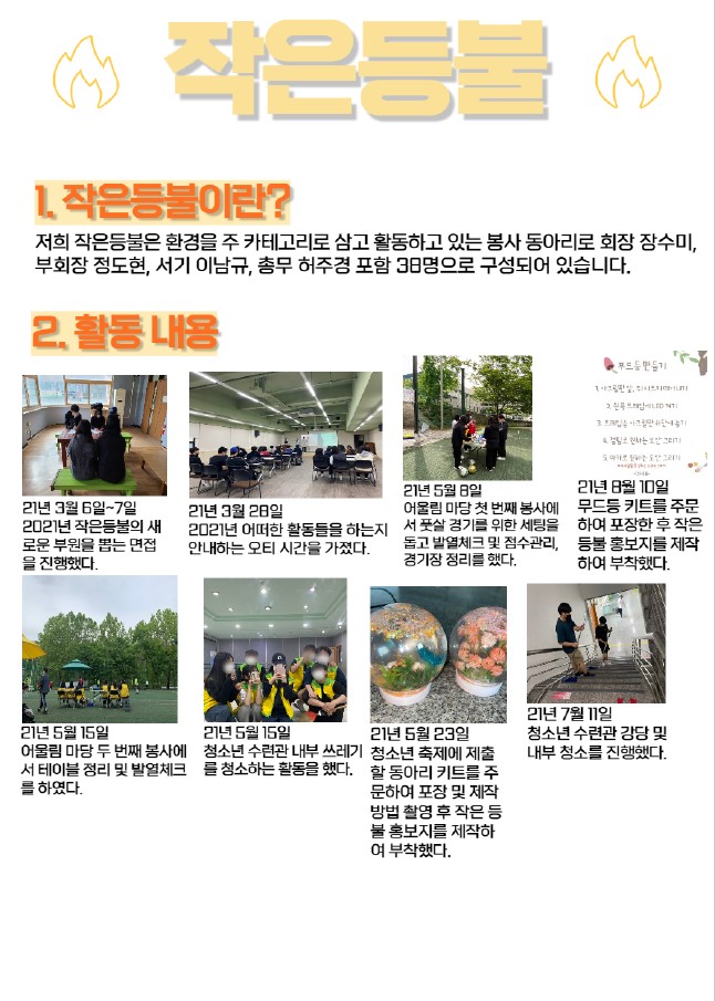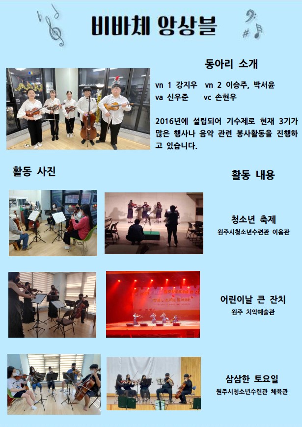 참여동아리 : 소심, 트리라이브, 플로란스, 골든타임, 드림하이, 비바체앙상블, 시나브로, 연합회, 윤슬, 이브, 작은등불, 지천사, 폴라리스, 청소년운영위원회, 청소년참여위원회