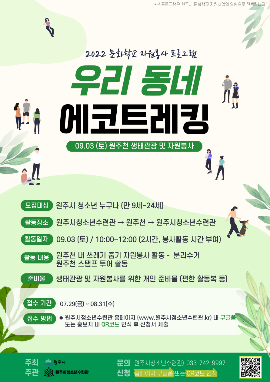 9월 3일(토) 10:00~12:00 약 두 시간 동안 원주시청소년수련관과 원주천에서 진행될 예정이며, 선착순 모집을 통해 12명의 청소년들을 모집합니다. 해당 프로그램에 참여하는 청소년들에게는 봉사활동 2시간을 부여합니다.