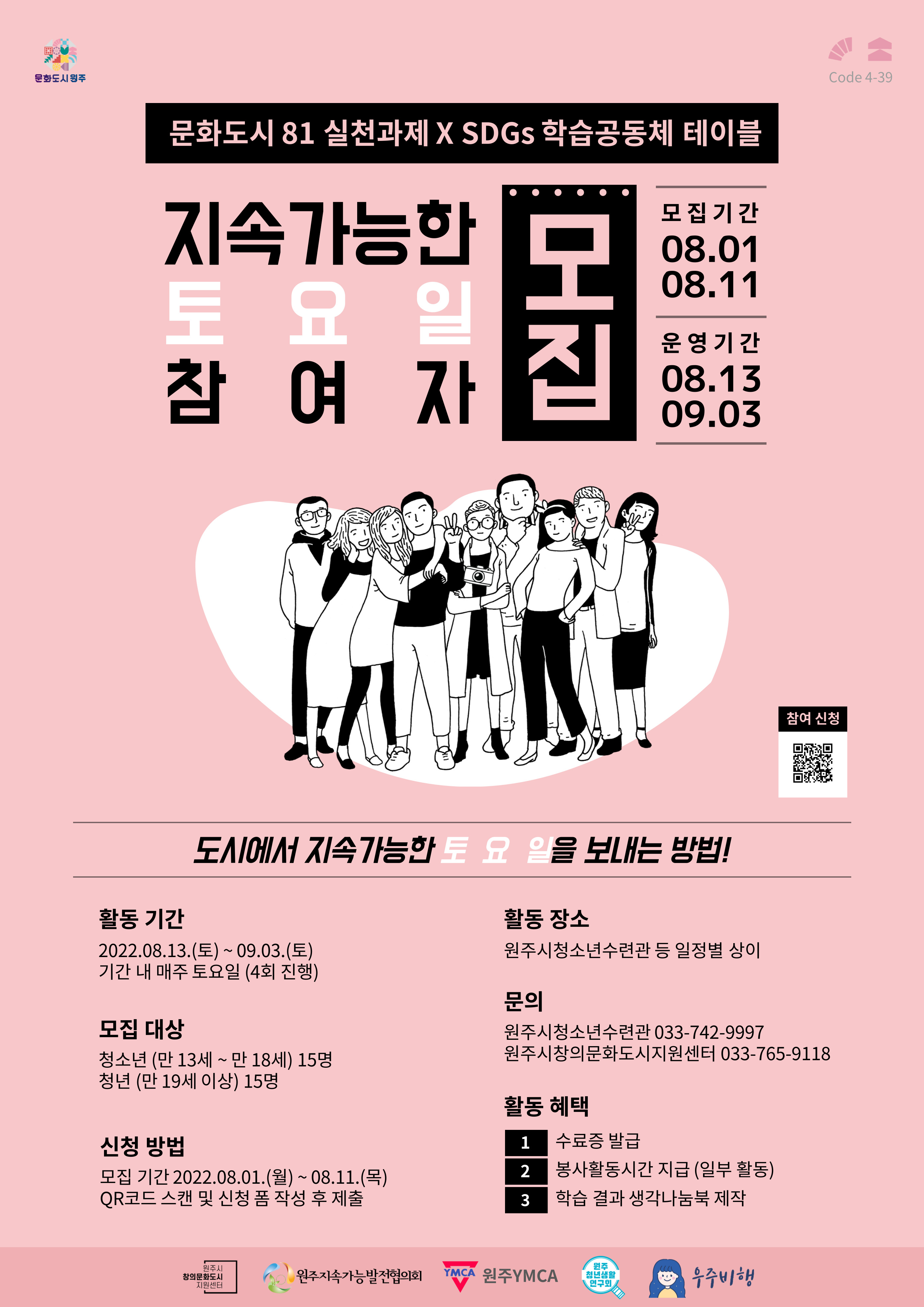 현재를 살고 있는 우리가 미래에도 가치있는 삶을 살수 있도록 내가 사는 지역의 환경,차별, 자원들을 학습하고 더 나아가 우리나라, 세계시민의 역할을 할 수 있도록 역량을 키워 지속가능한발전이 이루어져 더 나은 미래를 만들어 갈 수 있도록 많은 관심과 신청 부탁드립니다 :D