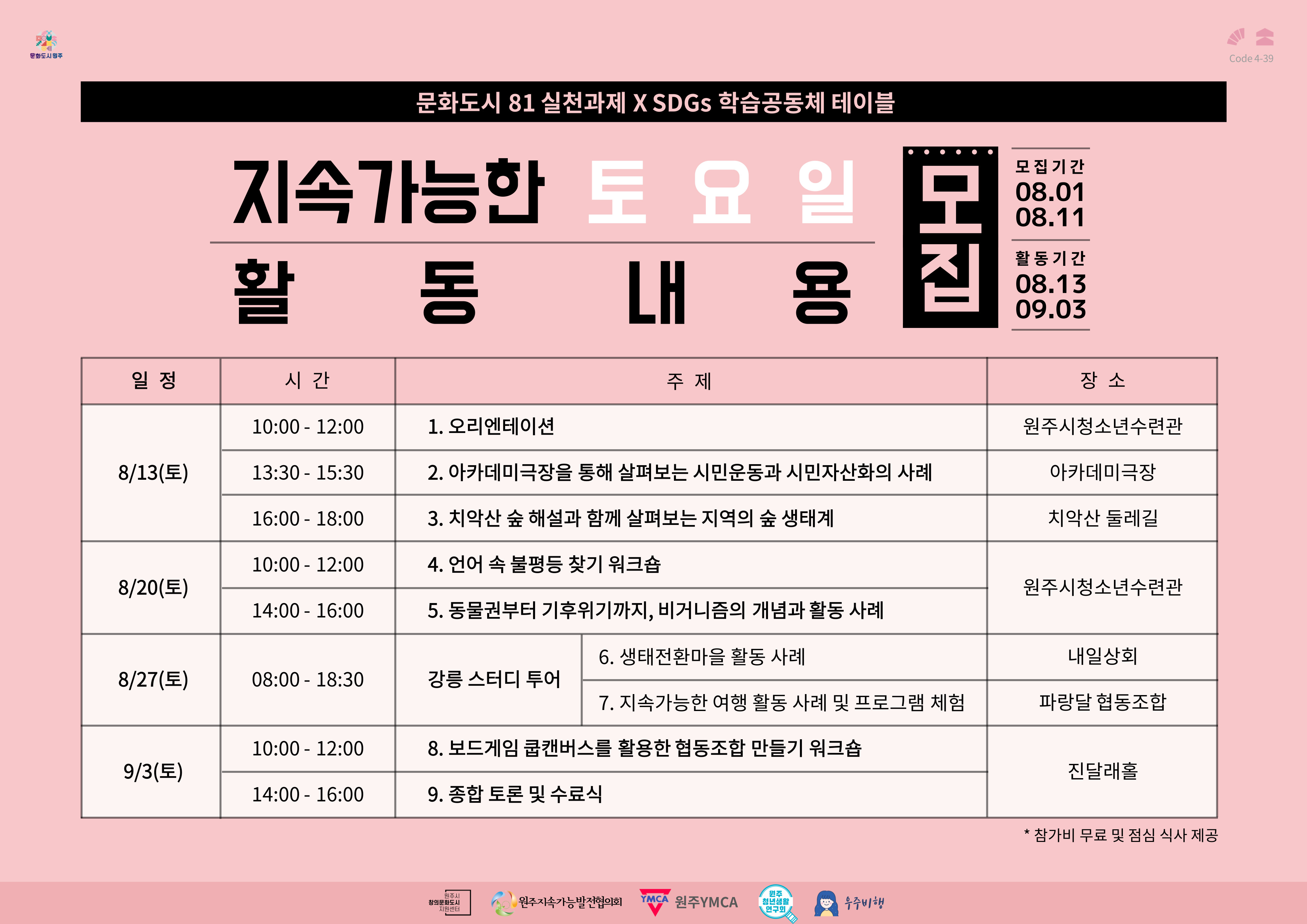 문화도시 원주에서 진행하는 UN-SDGs(지속가능발전목표)를 학습하고 지역의 공간 및 콘텐츠와 연결하여 체험하는 SDGs 학습공동체 테이블 : [지속가능한 토요일] 프로그램을 진행합니다!