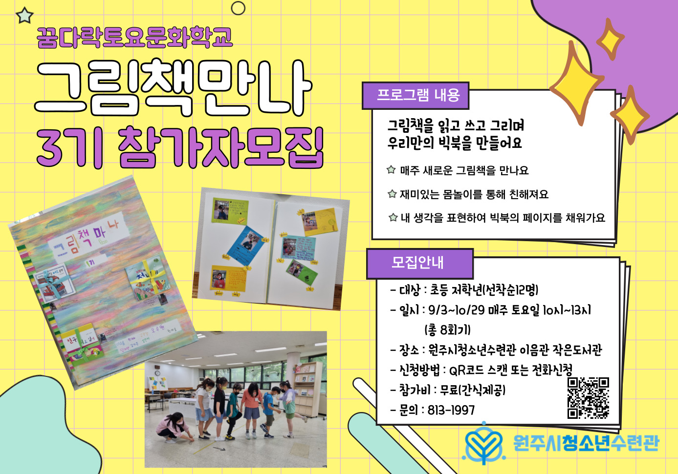 안녕하세요 원주시청소년수련관 꿈다락토요문화학교 '그림책만나' 3기 참가자를 모집합니다.