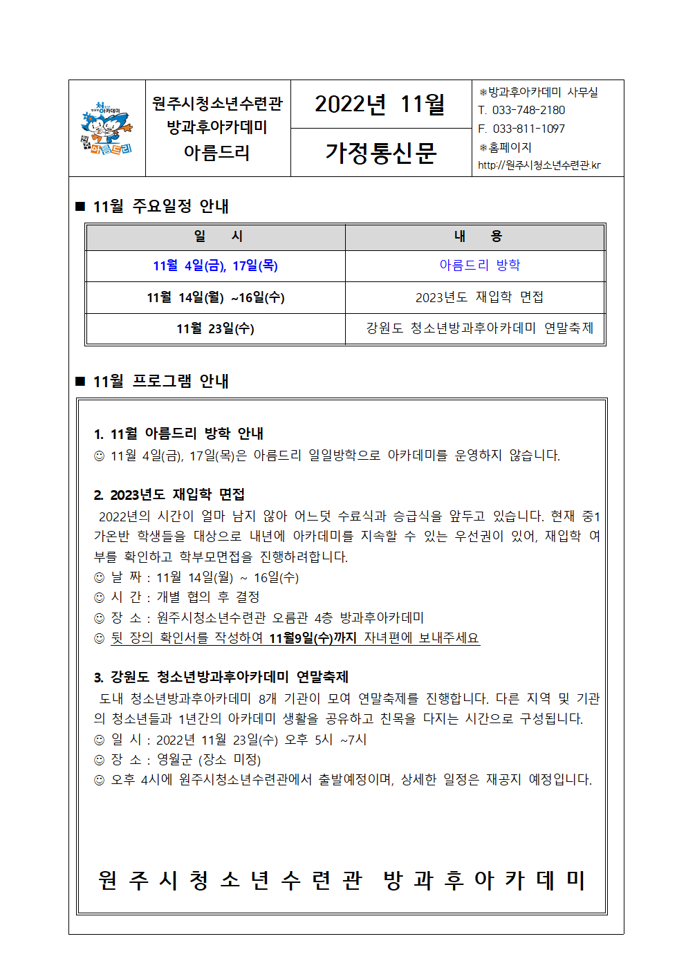 아름드리 11월 가정통신문