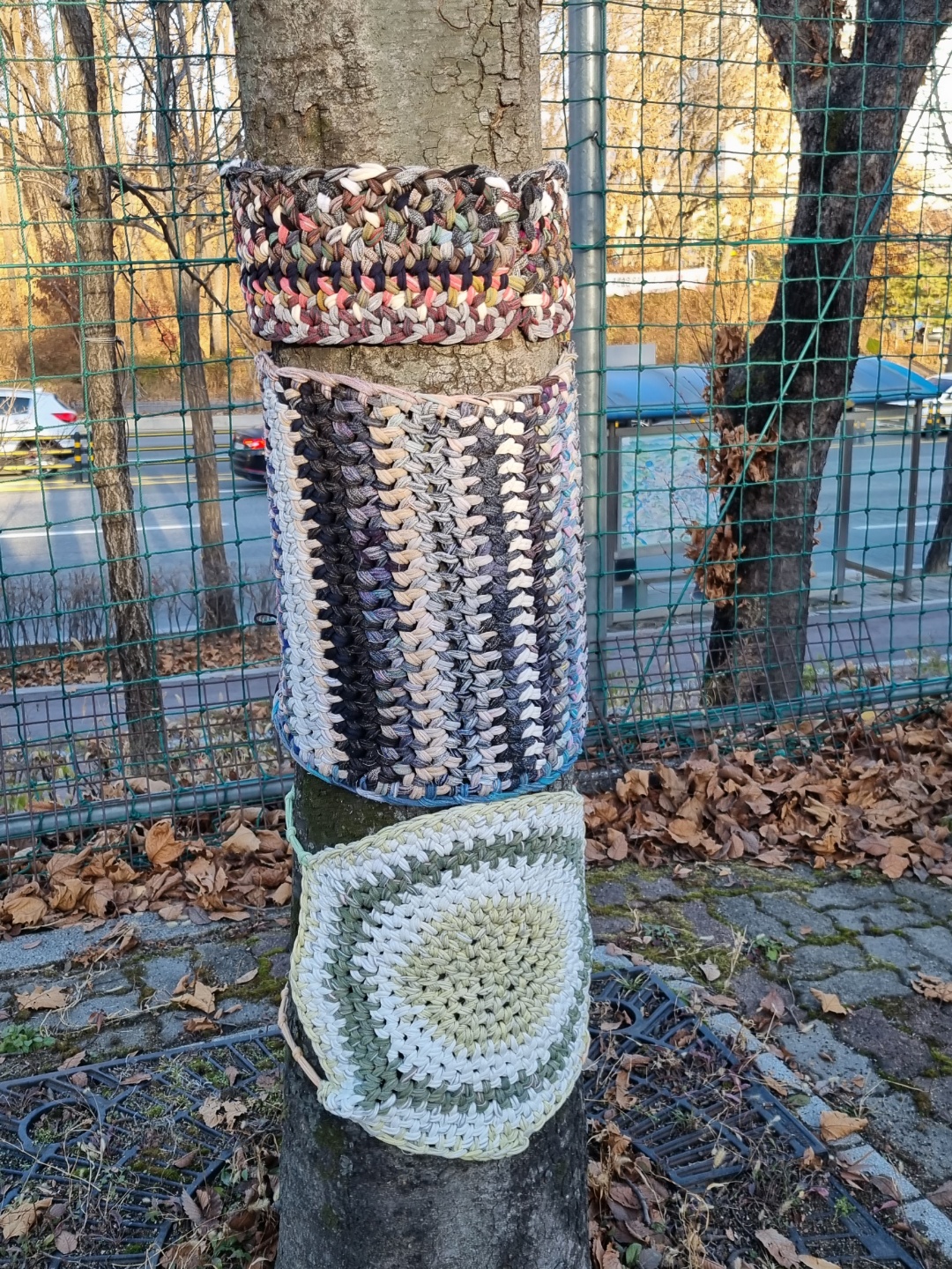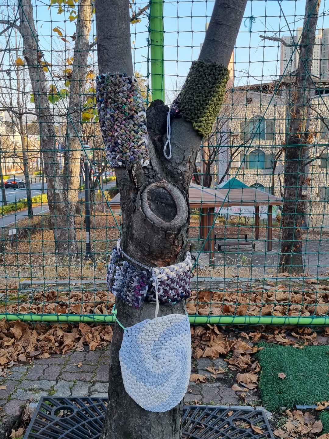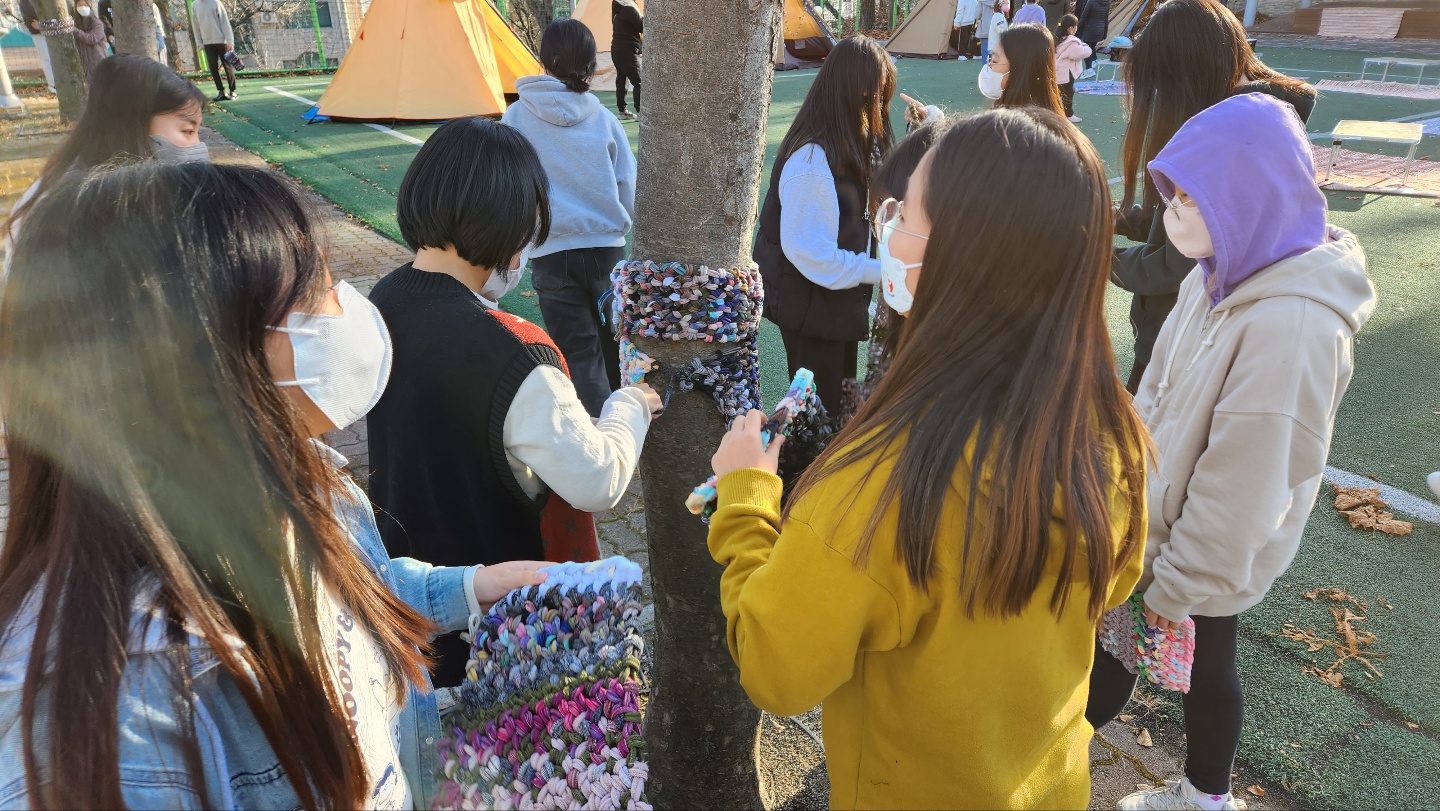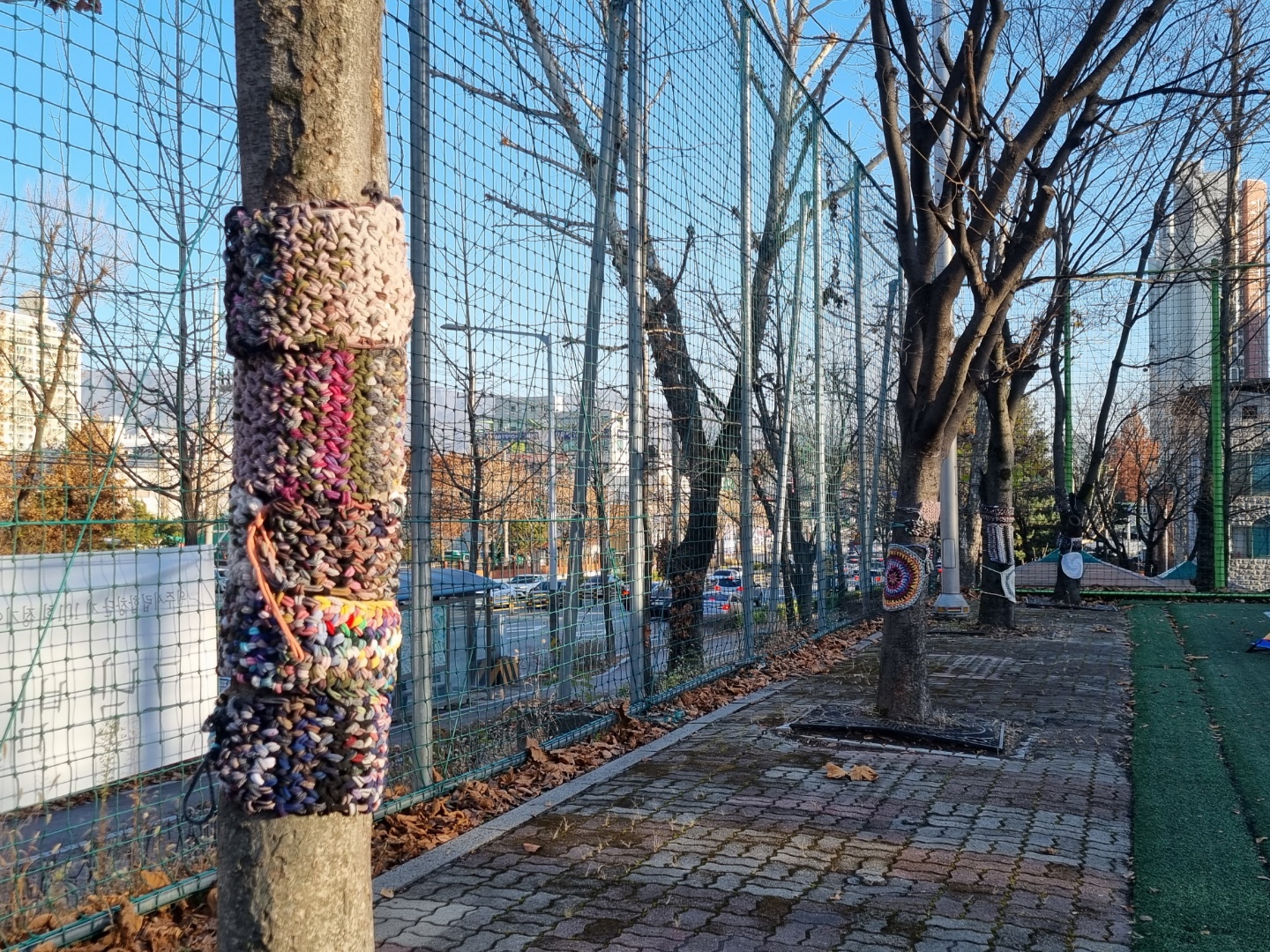 각자 완성한 양말목 작품으로 겨울나기를 준비하는 수련관 나무들에게 옷을 입혀주었습니다.