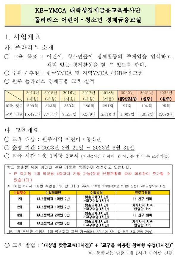 2023 상반기 KB폴라리스 경제금융교실 원주지역 참여학교/학급 모집