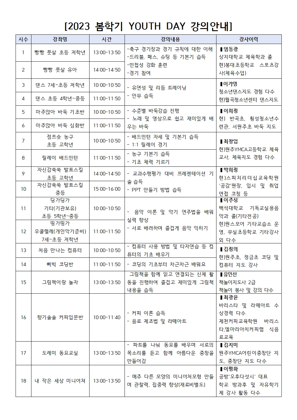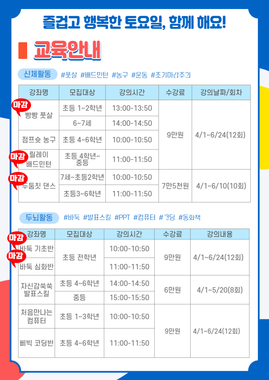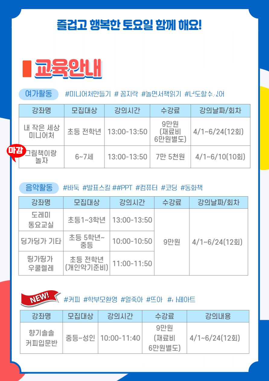 안녕하세요 2023년 봄학기프로그램에 관심을 가져주셔서 감사합니다. 즐겁고 신나는 일상을 보낼 수 있도록 다양한 프로그램을 준비했습니다! 모든 프로그램은 토요일에 진행되며 강좌명과 시