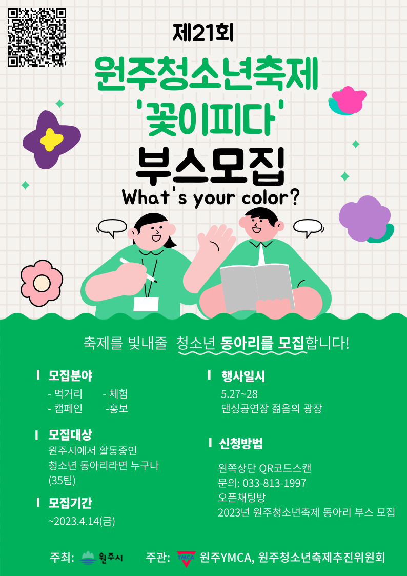 2023년 제21회 원주청소년축제 꽃이피다 동아리부스 모집