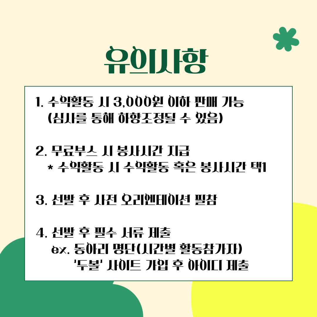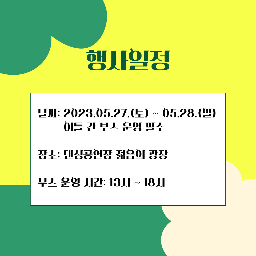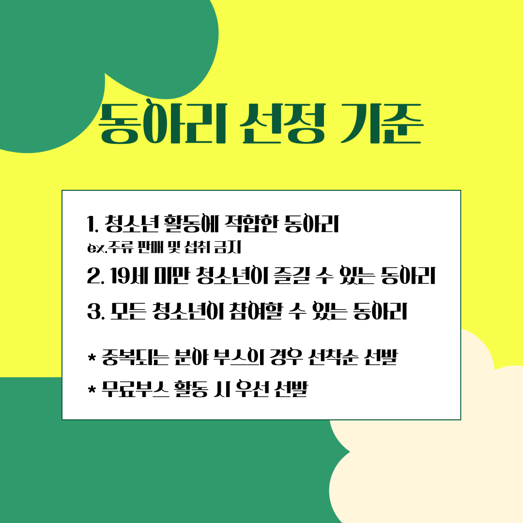 - 모집조건: 축제 이틀 간 부스운영이 가능한 동아리/청소년활동에 적합한 부스활동이 가능한 동아리(유료부스 운영가능)