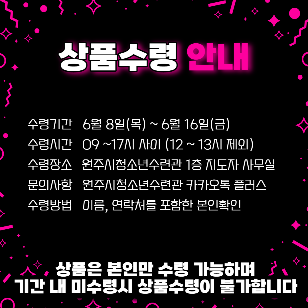 축하드립니다! 상품은 6월 8일 목요일부터 원주시청소년수련관에서 수령 가능하십니다.