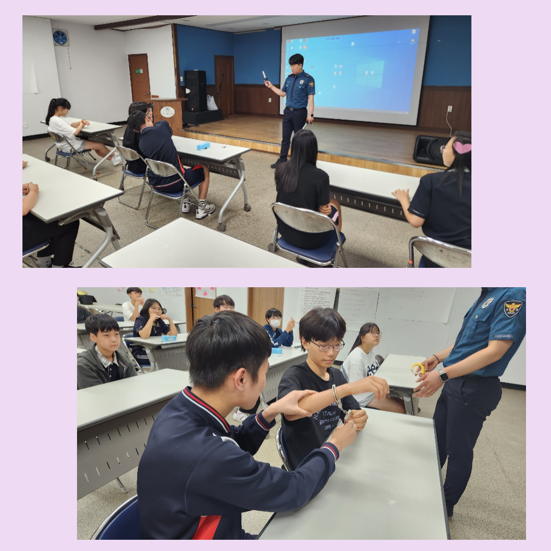 원주경찰서와 연계하여 학교폭력예방교육을 하며 경찰도구 실습도 하였습니다😊