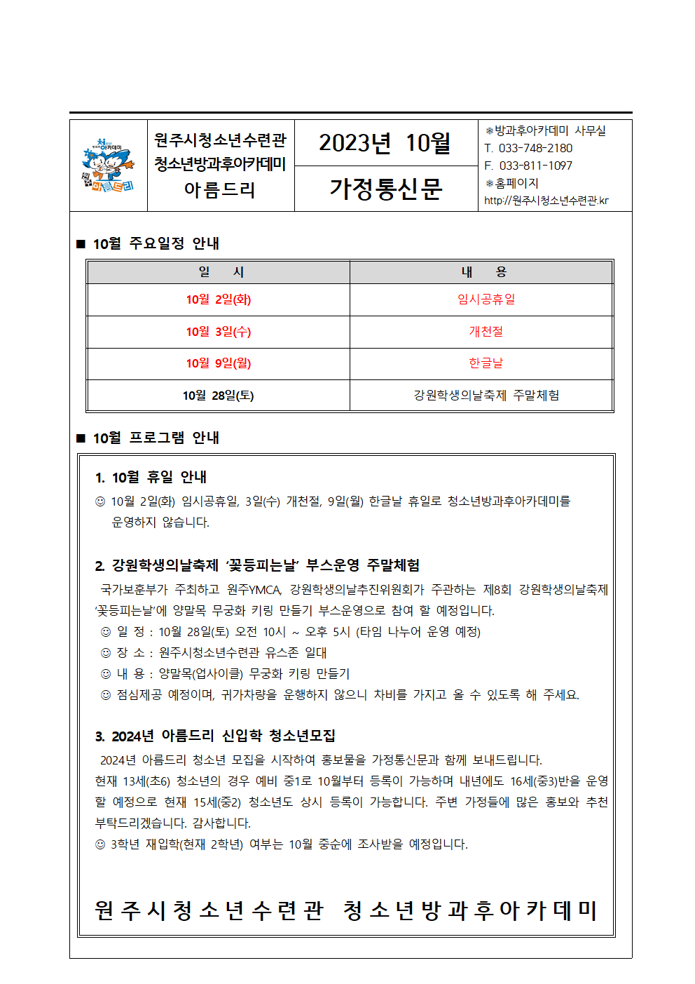 아름드리 10월 가정통신문