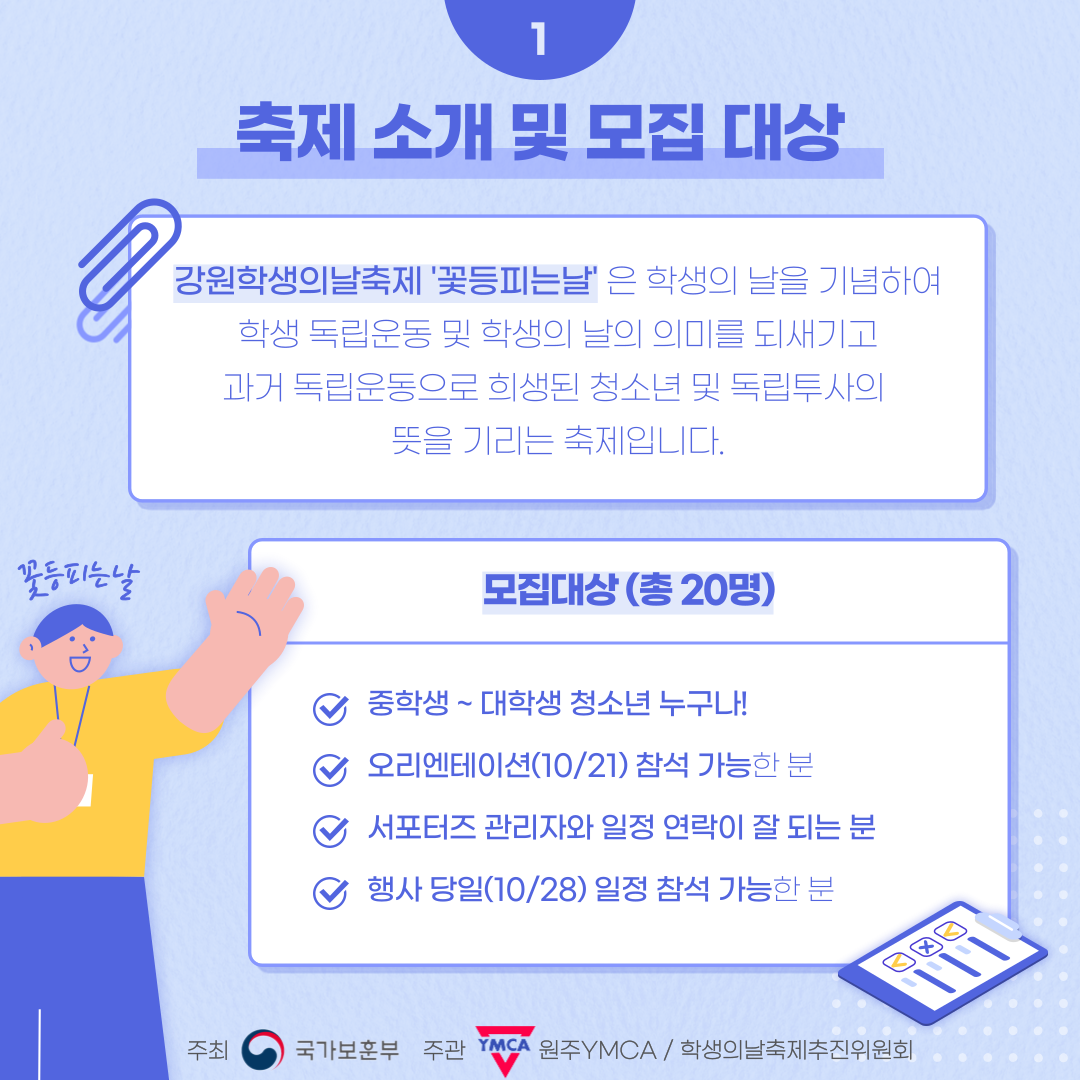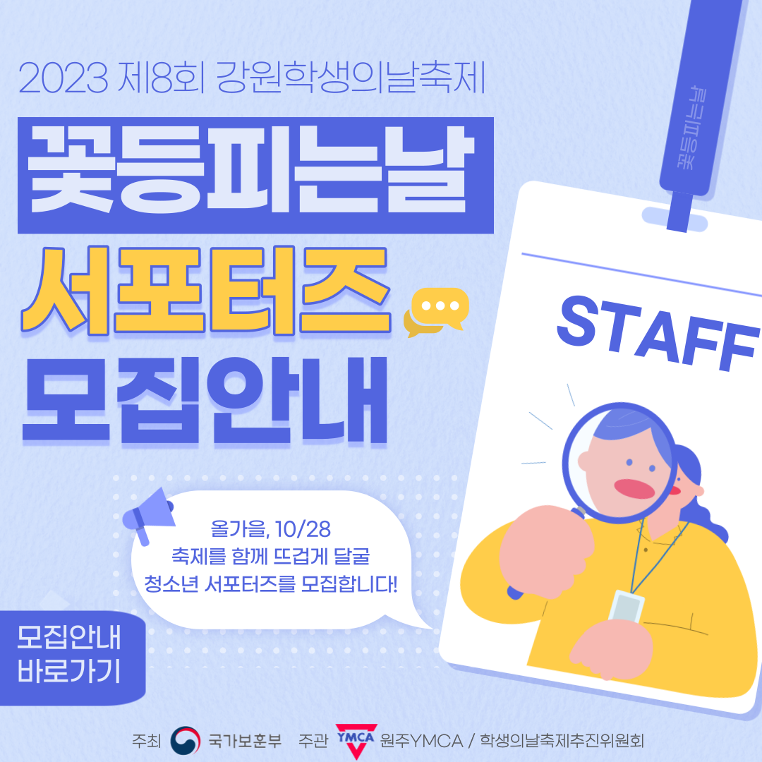 #강원학생의날축제 #꽃등피는날 #국가보훈부 #원주YMCA #원주시청소년수련관 #자원봉사 #청소년 #서포터즈 #모집