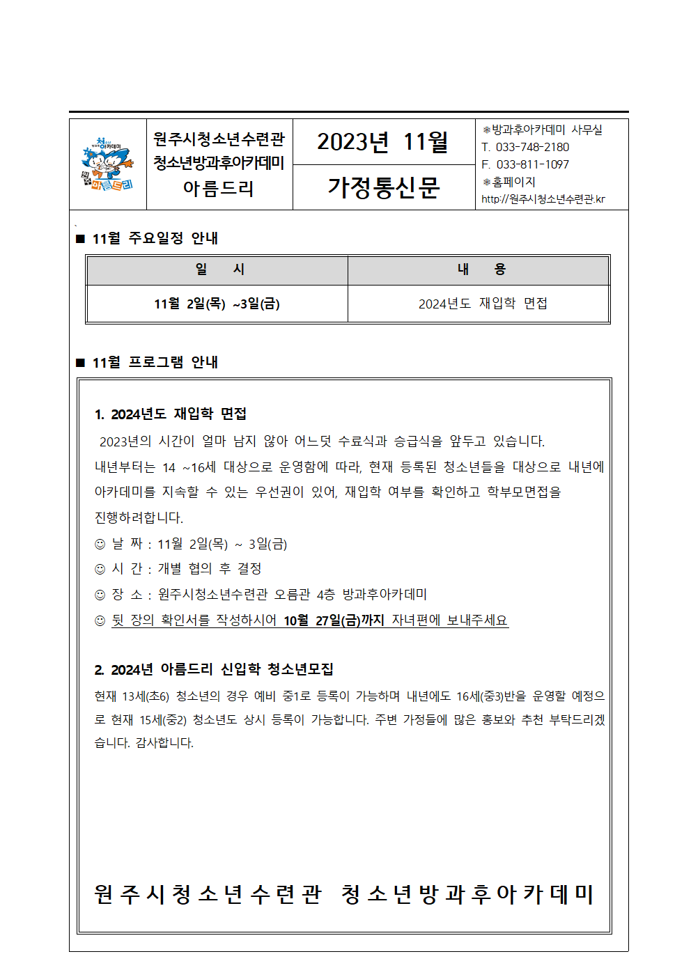 아름드리 11월 가정통신문