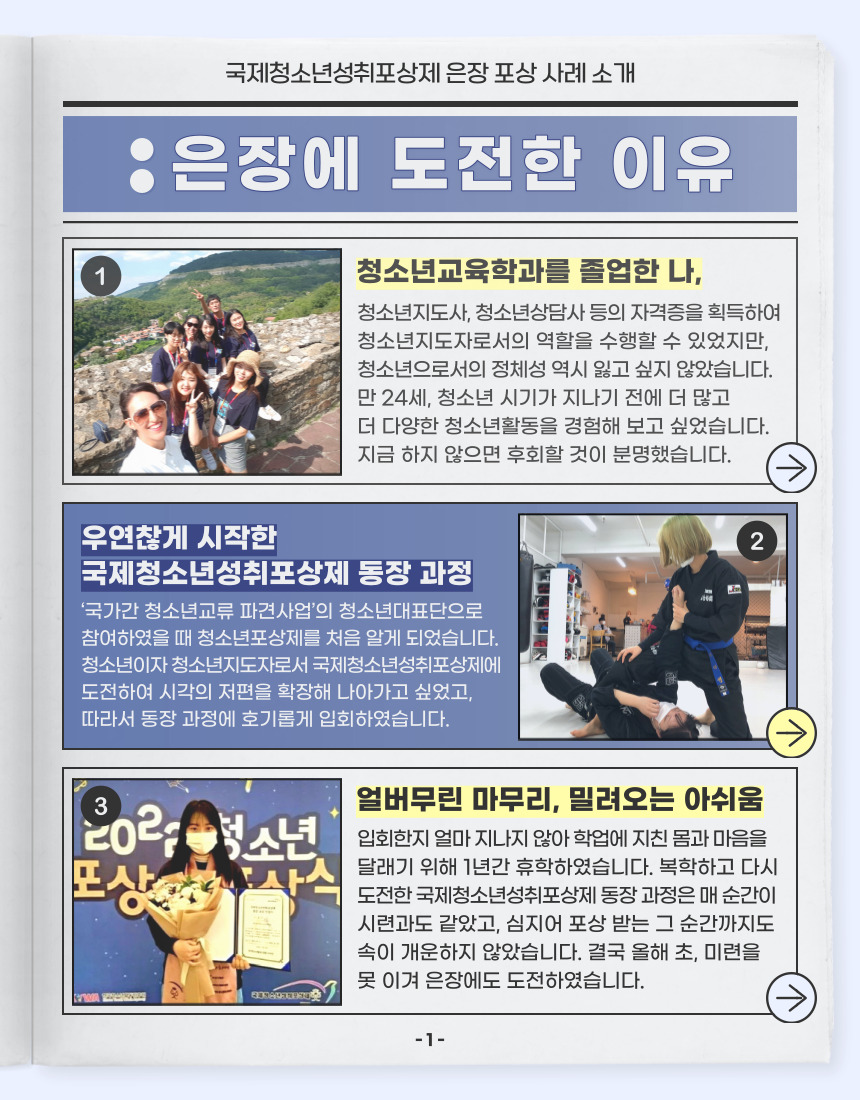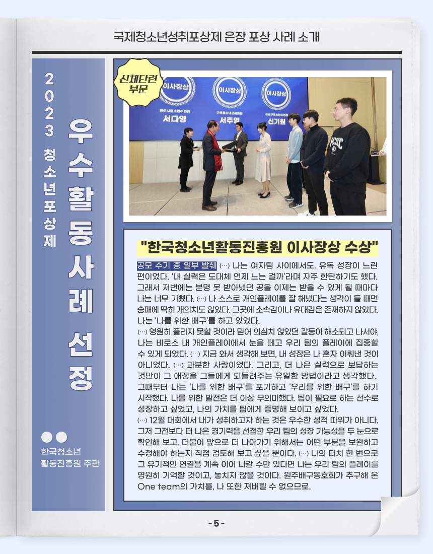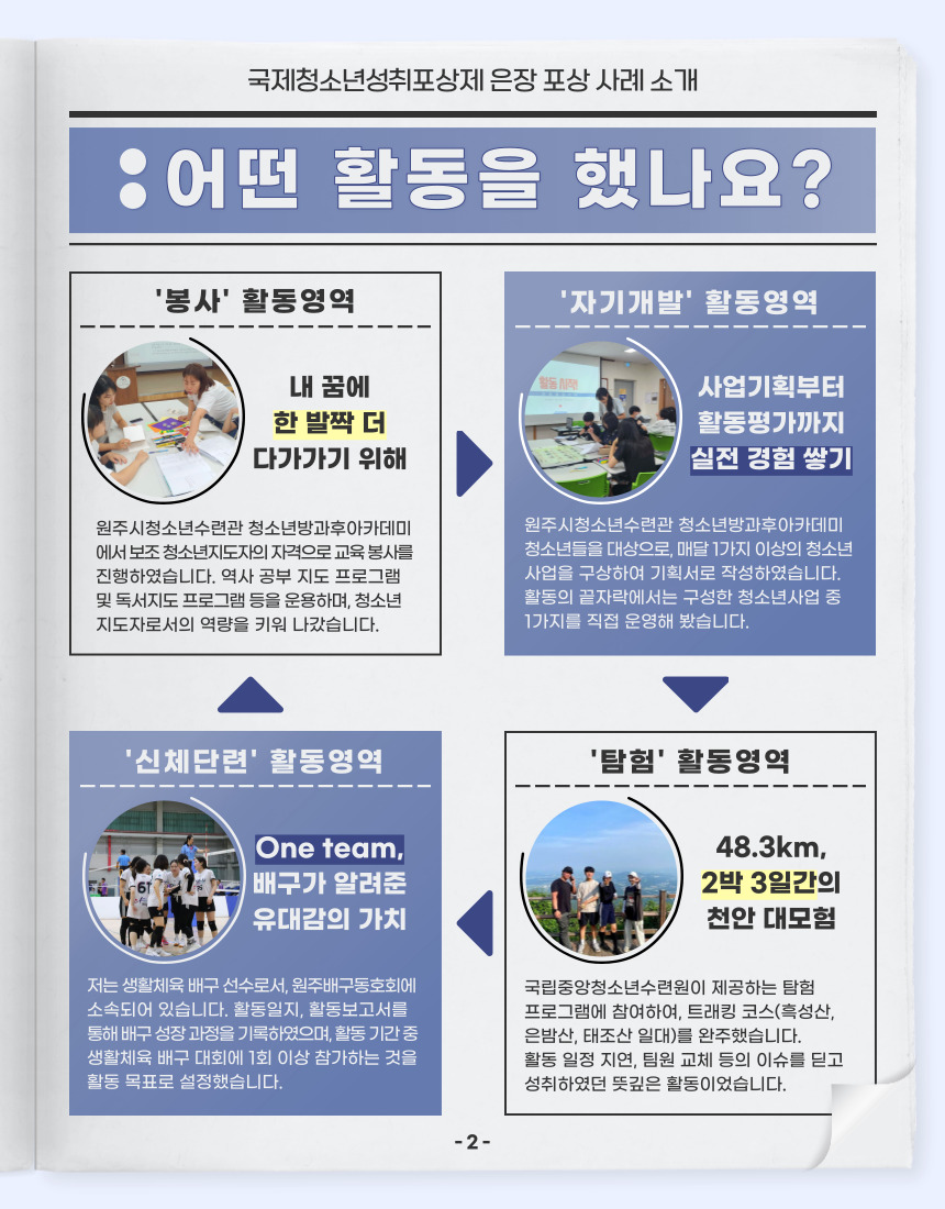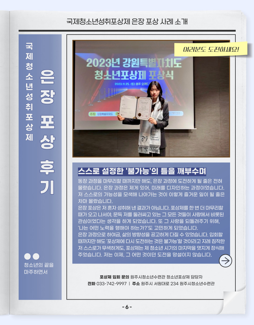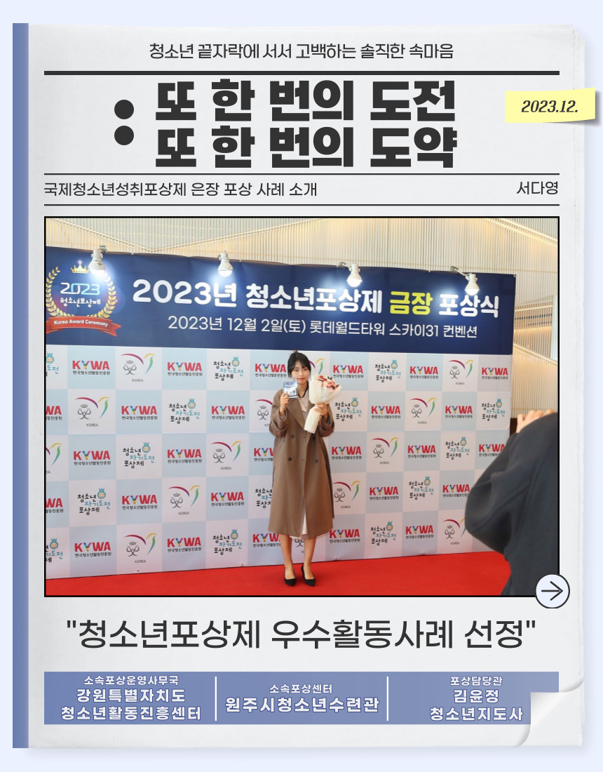 국제청소년성취포상제 은장 포상, 우수사례 이사장상 수상(서다영 청소년)