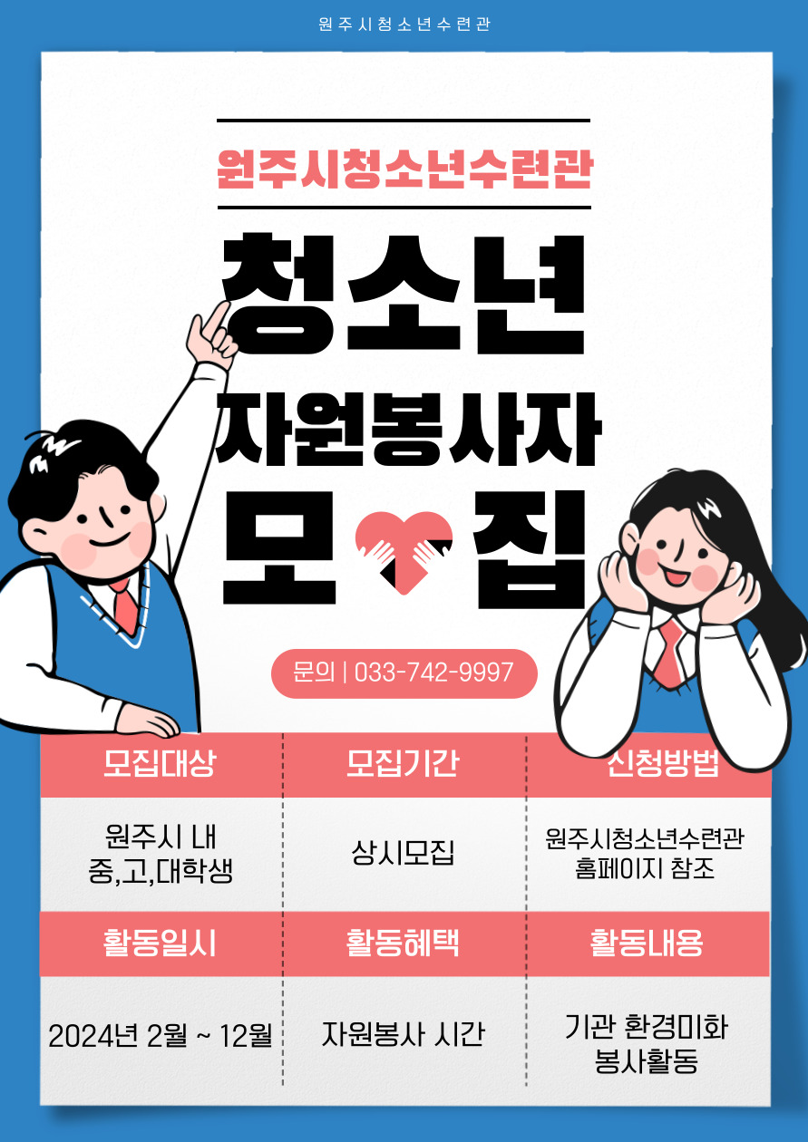 원주시청소년수련관에서 환경미화 자원봉사자를 상시모집하오니 많은 지원 부탁드립니다.
