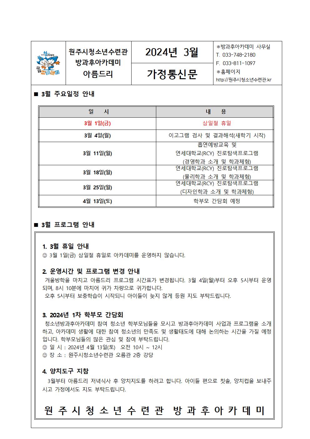 3월 아름드리 가정통신문