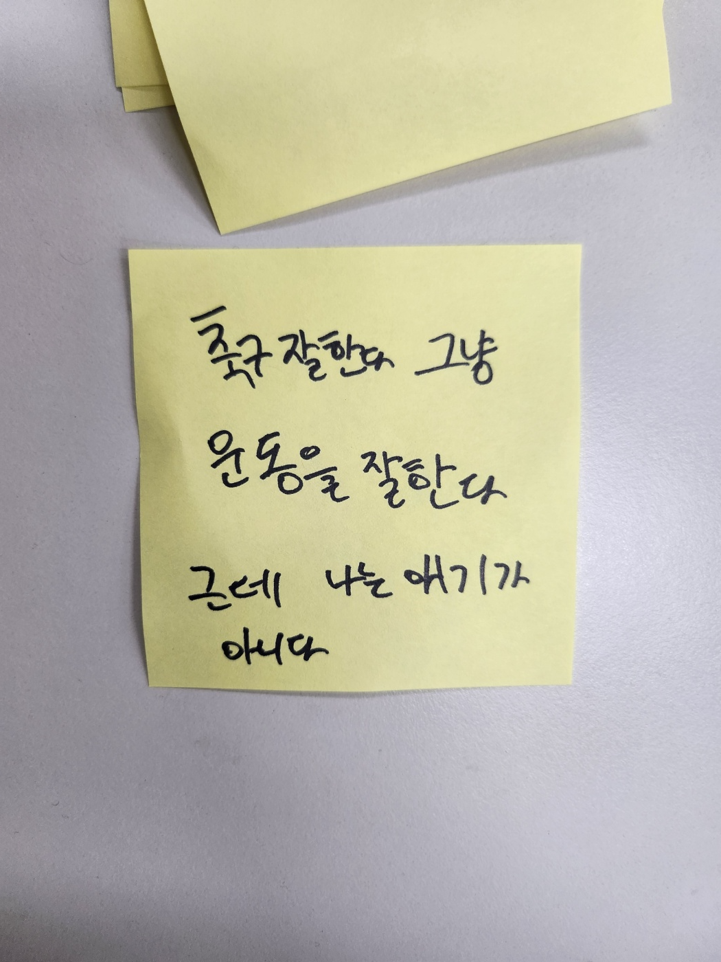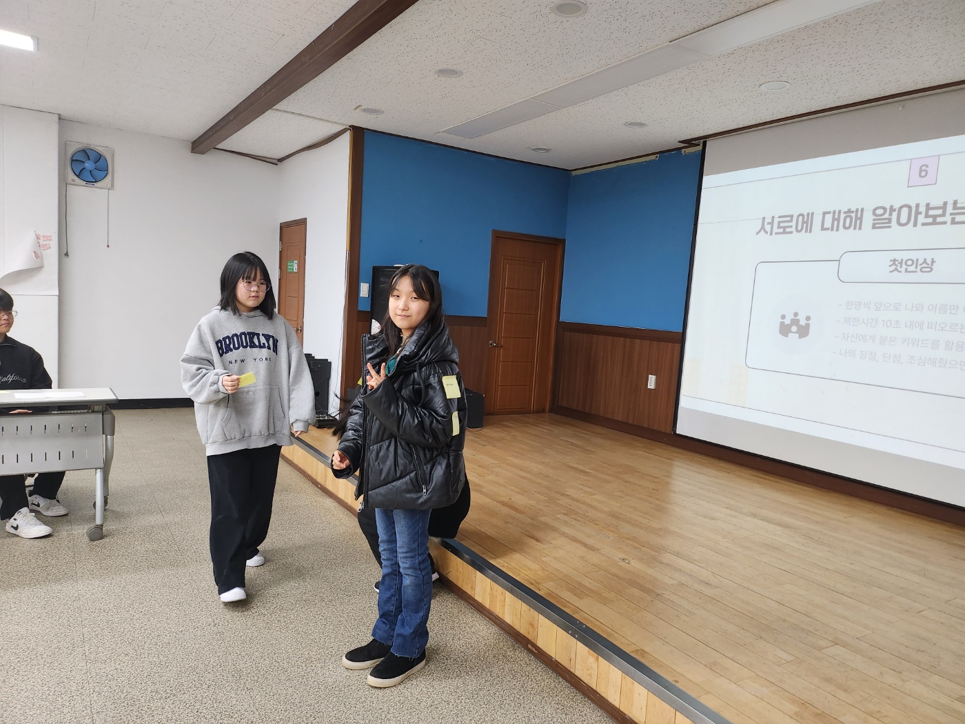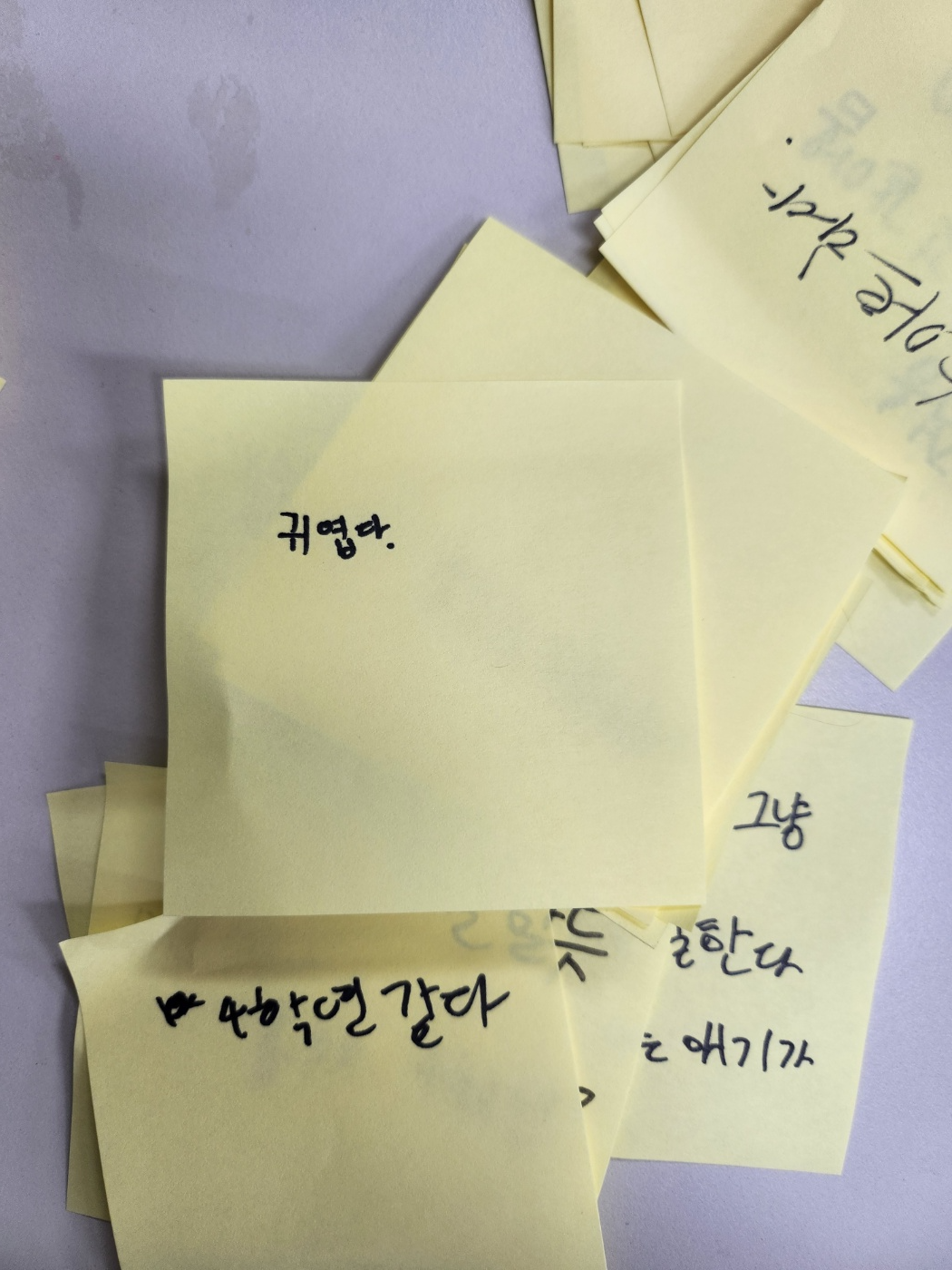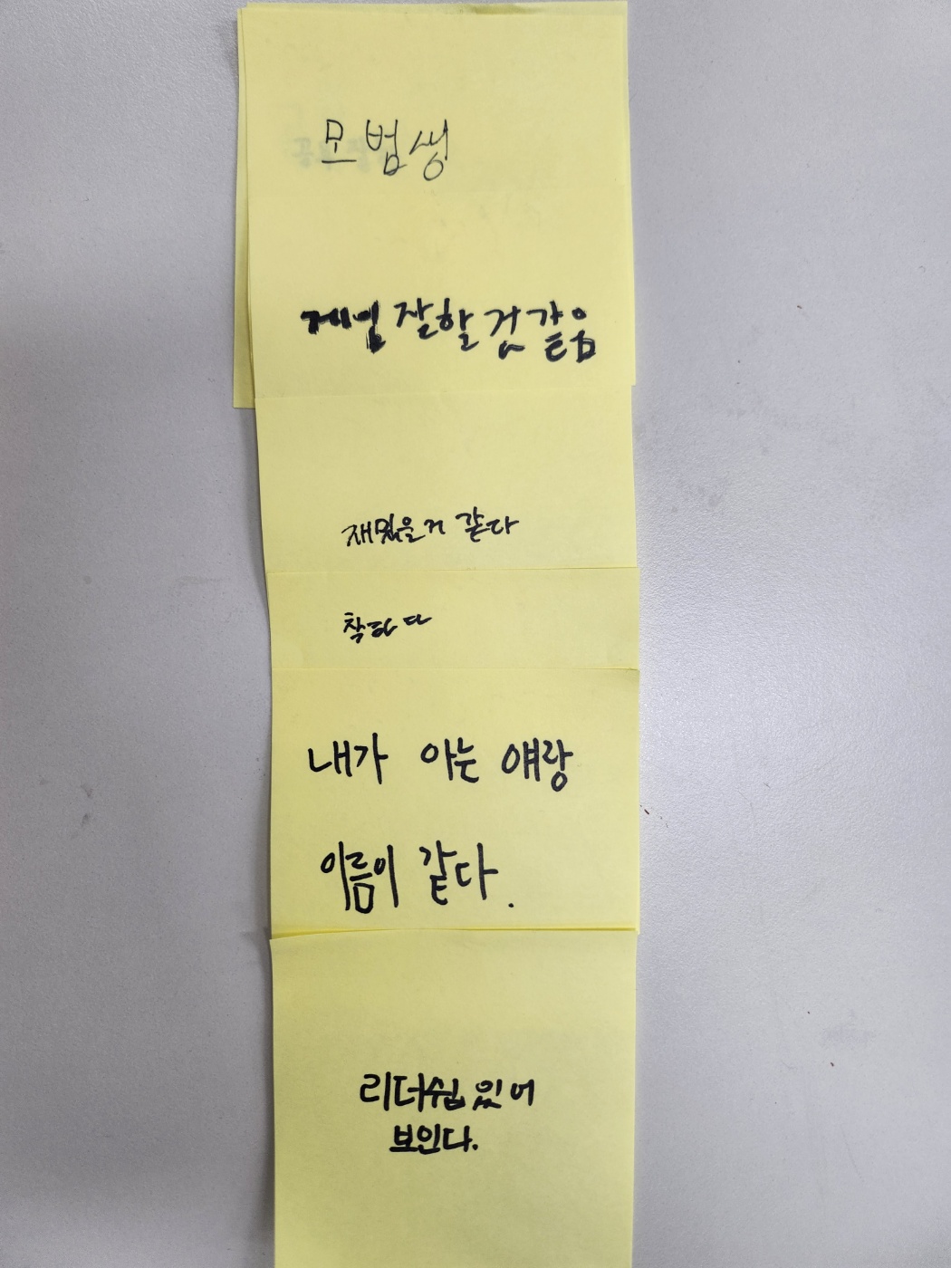 첫인상을 포스트잇에 적어 붙여주고 내가 받은 포스트잇을 확인하여 그에 맞는 자기소개를 하는 활동을 했습니다.